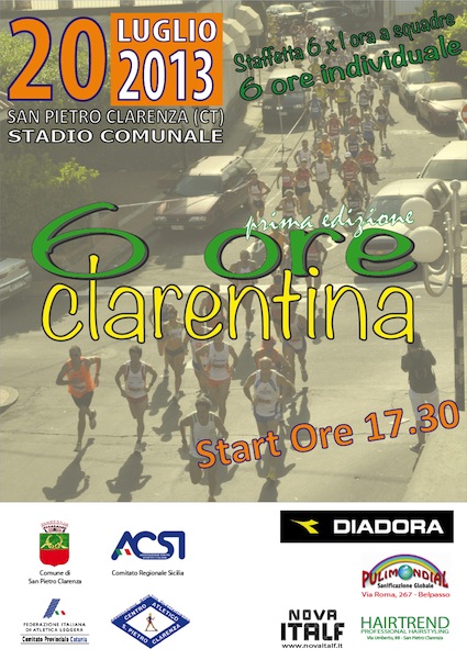 Manifesto_60re_2013Tutto pronto per la prima edizione della 6 ore clarentina in programma a San Pietro Clarenza questo pomeriggio. La manifestazione organizzata dal Centro Atletico San Pietro Clarenza, diretta dal campione azzurro Dario Privitera, e con il patrocinio dell’Amministrazione Comunale di San Pietro Clarenza e la collaborazione tecnica della FIDAL CATANIA e ACSI Sicilia, si svolgerà all’interno dello stadio comunale clarentino sito al Villaggio delle Ginestre.