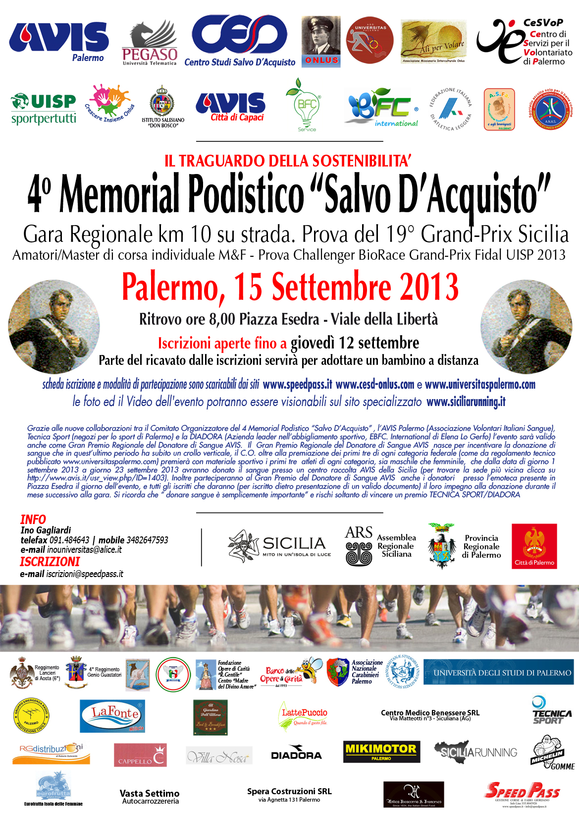 memorial_2013psdA pochi giorni dalla “partenza” di uno degli eventi podistici di maggiore interesse e valenza del panorama regionale siciliano, in programma nel cuore di Palermo domenica 15 settembre 2013,  il Comitato Organizzatore del CESD Onlus e ASD Universitas Palermo grazie al cordone ombelicale che lo lega alla gloriosa Arma dei Carabinieri allestirà in ambito della giornata sportiva dedicata alla memoria di Salvo D’Acquisto il prestigioso  “Gran Premio Nazionale Interforze”. Gli atleti appartenenti alle Forze dell’Ordine accederanno a una speciale classifica a loro dedicata con relativa premiazione dei primi tre di ogni categoria. I nuovi riconoscimenti che andranno agli atleti in divisa   si affiancano ai premi spettanti ai primi tre di ogni categoria A/M FIDAL collocando la manifestazione tra le più generose in assoluto. Ma  non solo i più forti atleti porteranno a casa dei premi, grazie alle aziende PEGASO UNIVERSITA’ TELEMATICA e TECNICASPORT DIADORA  a tutti i partecipanti sarà consegnato un premio da collocare tra i più belli della loro carriera sportiva.