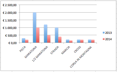 Risparmio nella quota da versare per l’organizzazione delle gare a livello regionale rispetto al 2013 su pista (-33,3%), maratona (-50%), mezzamaratona (-58,3%), strada (-60%), marcia (-28,6%), cross e corsa in montagna (-4,8%).