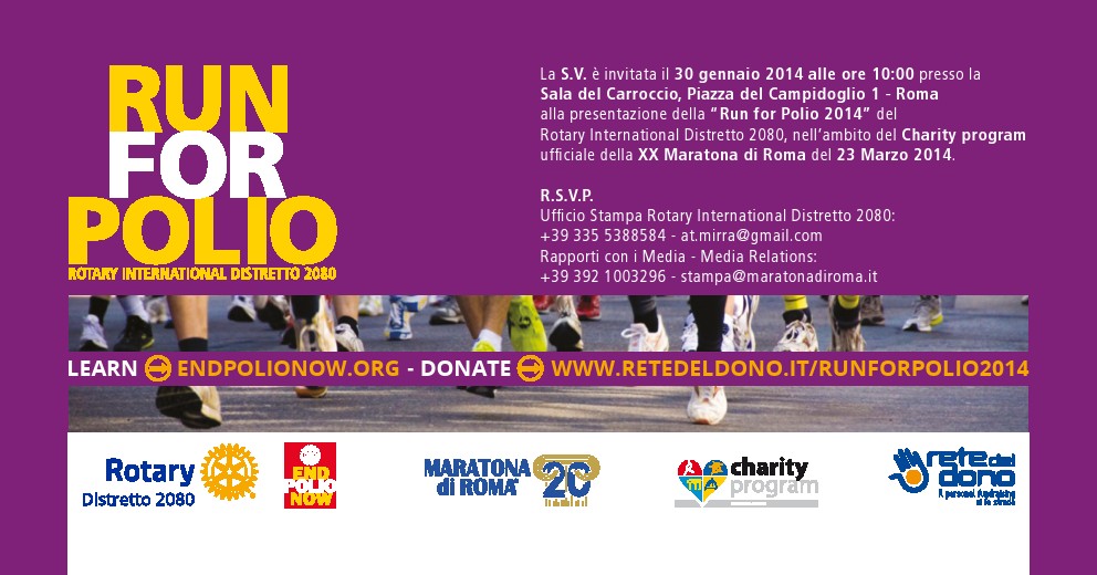 A parlare di “Run for Polio 2014” saranno,giovedì 30gennaio 2014 alle ore 10.00 presso la Sala del Carroccio in Campidoglio, il Governatore del Rotary International – Distretto 2080, Avv.Pier Giorgio Poddighe, ed il Presidente della Maratona di Roma, Dr.EnricoCastrucci.
