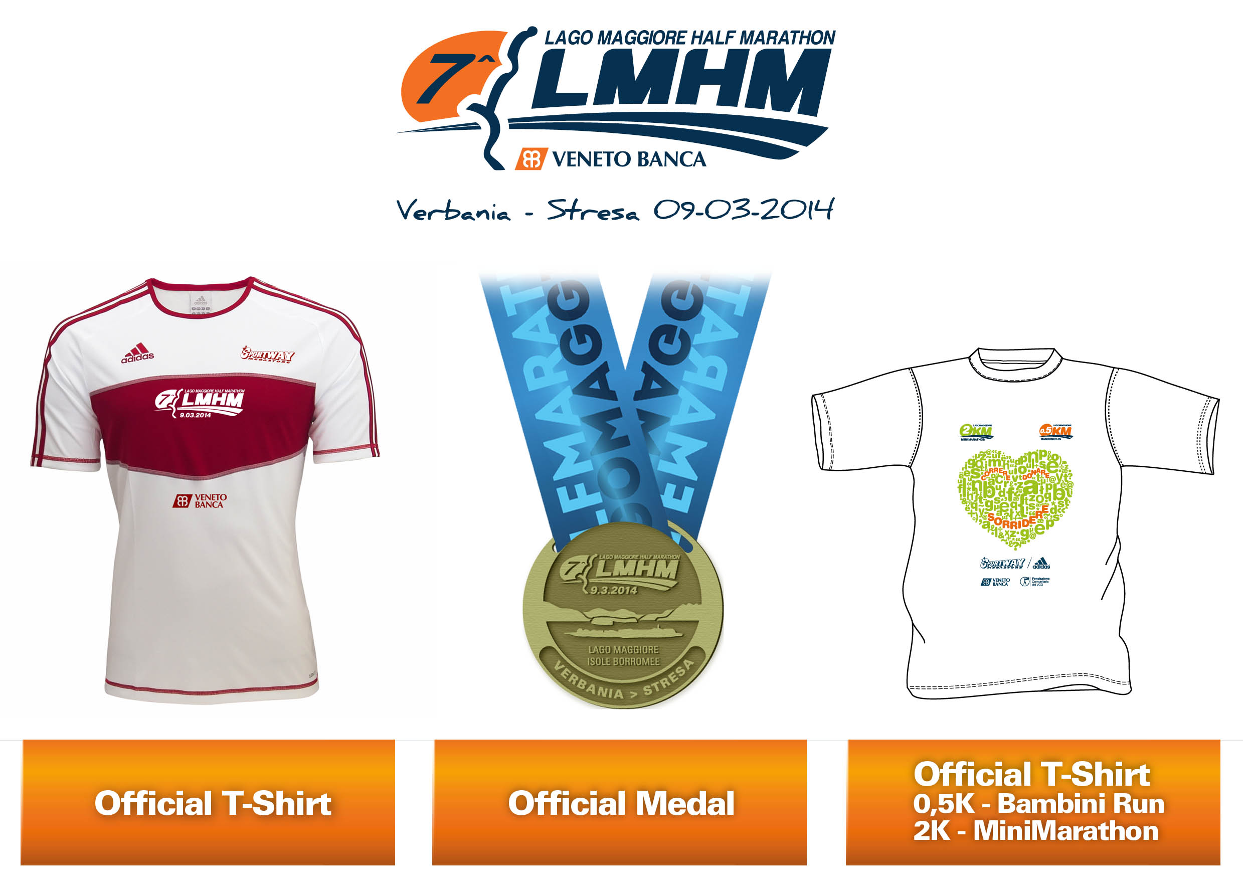 Questa importante modifica sembra essere stata apprezzata dai podisti, viste le numerose iscrizioni già pervenute: al momento, e lo sarà fino al 15 febbraio, la quota d’iscrizione è di 25,00 €; dal 16 febbraio al 28 febbraio il costo d’iscrizione sarà di € 30,00 €; ci si potrà iscrivere anche allo Sport Expo, che quest’anno sarà a Verbania, a Villa Giulia, il 7 e 8 marzo 2014, ma al costo ulteriormente maggiorato di € 40,00. Intanto sono stati presentati il gadget tecnico che sarà dato a tutti gli iscritti, una bellissima t-shirt tecnica adidas, e la medaglia con cui saranno premiati tutti i partecipanti alla settima edizione della Veneto Banca Lago Maggiore Half Marathon.