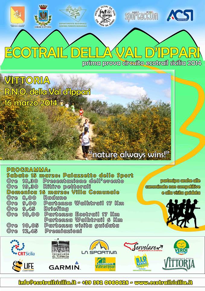 L’Ecotrail della Val D’Ippari, giunto alla quarta edizione, prenderà il via come consuetudine dalla Villa Comunale di Vittoria. Domenica alle h 9.00 si inizierà con il walk trail di 17 chilometri, dedicato agli amanti della passeggiata in natura; alle h 10,00 il via alla gara agonistica, valida anche come prova del Grand Prix provinciale di corsa. 17 chilometri, con continui sali scendi, attraverso la Valle dell’Ippari e la Riserva Naturale Orientata del Pino D’Aleppo, dove risiede quello che può essere considerato l’ultimo insediamento di Pinus halepensis (Pino d’Aleppo) allo stato spontaneo in Sicilia; allo stesso orario partirà un walk trail, accessibile a tutti, di 6 chilometri, mentre cinque minuti dopo, il via alle escursioni guidate. A coadiuvare gli organizzatori del circuito nella tappa ragusana anche quest’anno l’Associazione Sportiva NO AL DOPING E ALLA DROGA.