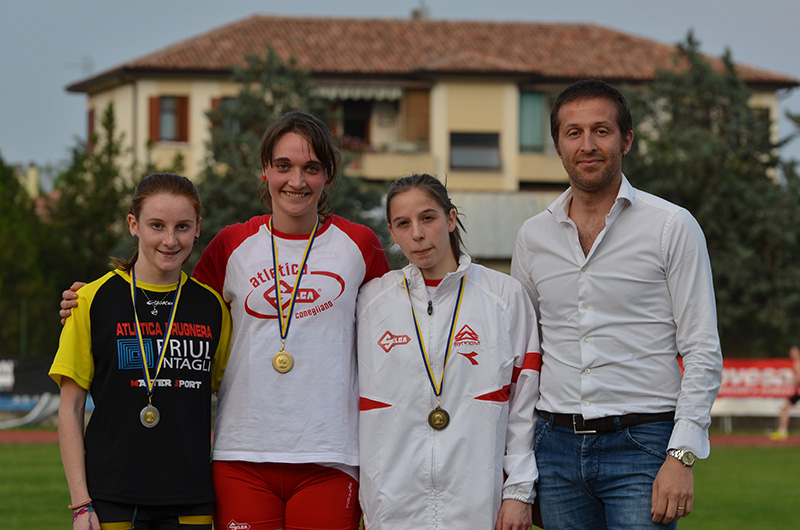 FEMMINILI. Juniores. 100. 1. Irene Vian (Atletica Silca Conegliano) 12’’85, 2. Sara Borille (Casa Atletica) 13’’37, 3. Giulia Gardin (Atletica Longarone) 13’’92. 800. 1. Irene Vian (Atletica Silca Conegliano) 2’12”79, 2. Lucrezia Zanardo (Atletica Brugnera Friulintagli) 2’20”02, 3. Carolina Michielin (Atletica Silca Conegliano) 2’24”68. Lungo. 1. Giada Bozzelli (Ga Aristide Coin Venezia 1949) 4.87, 2. Sara Borille (Casa Atletica) 4.86, 3. Erica Venuti (Atletica Silca Conegliano) 4.58. Allieve. 100. 1. Emma Girardello (Rhodigum Team ASD) 12”43, 2. Chiara Mometti (Atletica Sernaglia Mob Villanova) 13”32, 3. Martina De Deppo (GS La Piave) 13”61. 800. 1. Laura De Marco (GS Fiamme Oro Padova) 2’25”50, 2. Veronica Camerin (Atletica Brugnera Friulintagli) 2’29”27, 3. Anna Dal Magro (Atletica Dolomiti Belluno) 2’31”38. Lungo. 1. Caterina Maleville (Atletica Vis Abano) 5.21, 2. Andrea Bronzati (Libertas Valpolicella Lupatotina) 4.96, 3. Chiara Giubilato (Atletica Silca Conegliano) 4.87. Cadette. 80. 1. Teresa Gatto (Nuova Atletica S. Lazzaro) 10’’40, 2. Noemy Petagna (Athletic Club Firex Belluno) 10’’45, 3. Giulia Menegale (Atletica Silca Conegliano) 10’’55. 1000. 1. Nikol Marsura (Trevisatletica) 3’00”16, 2. Giulia Schiff (Atletica Riviera Del Brenta) 3’06”17, 3. Irene Salvadori (La Fenice 1923 Mestre) 3’13”29. Giavellotto. 1. Celestine D’Amedeo (Pol Libertas Lupatotina) 37.19, 2. Stefania Fusaro (Usr Lasen-Latte Albaluna) 30.34, 3. Chiara Marocchio (Polisportiva Libertas Lupatotina) 29.52. Ragazze. 60. 1. Sara Busatto (Atletica Mogliano) 8’’58, 2. Ilaria Varago (Atletica Sernaglia Mobilificio Villanova) 8’’84, 3. Anna Cassol (Athletic Club Firex Belluno) 8’’85. 1000. 1. Orsola Ongarato (La Fenice 1923 Mestre) 3’40”95, 2. Linda Marangon (Venezia Runners Atl Murano) 3’47”36, Anna Truschelli (Atletica Verona US Pindemonte) 3’51”70. Vortex. 1. Martina Prifti (Polisportiva Adige Buon Pastore) 41.74, 2. Laura Trevisan (Atletica Ponzano Gagno Autotrasporti) 40.80, 3. Ilaria Varago (Atletica Sernaglia Mobilificio Villanova) 33.45.