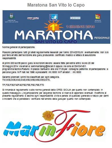 In programma domenica 1 giugno a San Vito Lo Capo la manifestazione podistica denominata “1a maratona regionale San Vito Lo Capo”. Si tratta di una gara in strada sulla distanza di 6000 metri. Il programma tecnico prevede il reduno in piazza del Santuario alle ore 17 per la consegna del pettorale. In premiazione andranno i primi tre M/F di categoria. E’ ancora possibile iscriversi a questo indirizzo mail: sammaritanog@tiscali.it o telefonando al numero di cell. 3341041451