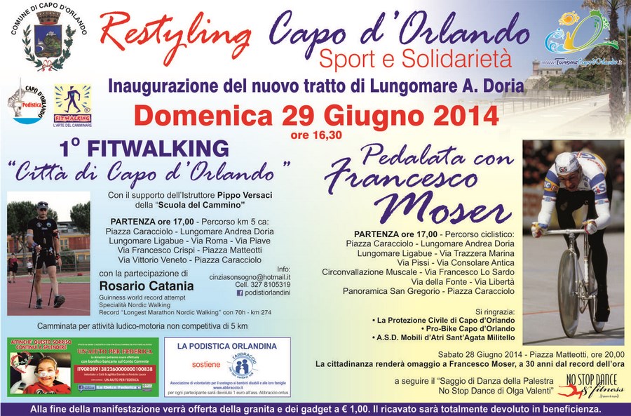 Che il prossimo 29 giugno fosse una giornata di sport a “tutto tondo” lo avevamo già scritto e annunciato. La gara del Grand Prix di corsa, la pedalata, la non competitiva. Il tutto, ciliegina sula torta, con un vero risvolto sociale, perché per ogni partecipante alla gara podistica, sarà devoluto un euro alle associazioni “L’abbraccio” e “Un’aiuto per Federica”. Della competitiva sappiamo in pratica già tutto, che si tratta della settima prova del GP di corsa su strada, che vivrà sulla distanza di 10 km (distanza certificata e omologata Fidal) e che vedrà al via, in tema di atleti, quanto di meglio il podismo siciliano può offrire in questo momento. Rimane qualcosa da scoprire, i premi, e qualche altra sorpresa, ma lo faremo nei prossimi giorni, step by step. Importante invece ribadire che il via alla gara avverrà alle 9.30 e che per combattere la probabile calura si stanno predisponendo più postazioni di ristoro con acqua e sali minerali, ben tre docce nebulizzate lungo il percorso e una buona dose di granita (incontrastata specialità del messinese) all’arrivo. Della pedalata sappiamo che sarà condotta da Francesco Moser, che festeggerà anche a Capo d’Orlando il trentennale del suo record dell’ora; della camminata sappiamo che avrà come testimonial uno che di camminate se ne intende Rosario Catania neo “Longest Marathon Nordic Walking”. Quello che non sapevamo ancora era come fare per prendere parte alla non competitiva dedicata a chi ha cominciato a correre da poco e a tutti gli accompagnatori degli atleti, mogli, fidanzate, mamme e figli. Detto, fatto con il regolamento, redatto dal presidente della Podistica Capo d’Orlando Cinzia Sonzogno che, ci ha confessato, ha già perso ore ed ore di sonno, per organizzare al meglio questa manifestazione. Per la non competitiva le iscrizioni si potranno fare il giorno della manifestazione direttamente in Piazza Matteotti a partire dalle ore 8:00. Per iscriversi basterà compilare la liberatoria allegata al regolamento pubblicato anche a margine di questo articolo, con allegata la copia del documento d’identità. La quota d’iscrizione è di € 5,00 che verrà interamente devoluta a due associazioni che seguono bambini diversamente abili. Saranno premiati i primi tre uomini e le prime tre donne che tagliano il traguardo e si presenteranno al giudice. Un menu sportivo dunque ricco e appetibile da gustare portata dopo portata, in attesa del dolce finale.
