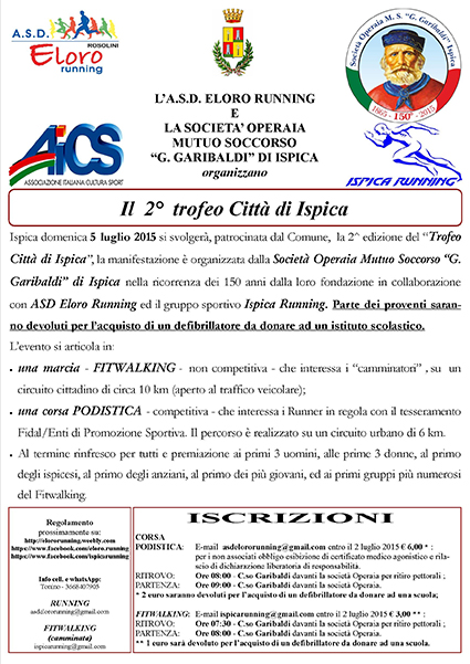 volantino trofeo ispicaMancano pochi giorni all’iniziativa firmata ASD Eloro Running, Ispica Running e Società Operaia Mutuo Soccorso “G. Garibaldi” di Ispica, che celebra i 150 anni dalla sua fondazione.