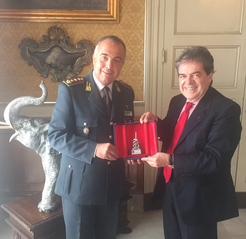sindaco Enzo Bianco ha consegnato l’Elefantino d’Argento per i 40 anni di attività di dirigente sportivo al Colonnello Vincenzo Parrinello, Comandante del Gruppo Polisportivo Fiamme Gialle e vicepresidente della Federazione Italiana di atletica leggera.