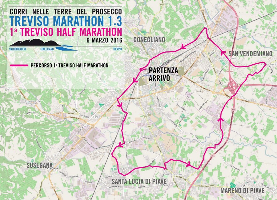Dopo la partenza, fissata alle ore 10.10, i podisti si dirigeranno a sud passando di fronte alla storica scuola enologica “Cerletti”. Una volta arrivati alla rotonda sulla statale, in località Ferrera, invece di procedere dritti verso Susegana come i maratoneti, gireranno a sinistra, in via dei Mille. Arrivati a Santa Lucia di Piave, si immetteranno nel percorso della maratona da via degli Alpini. I podisti passeranno vicino alla settecentesca Villa Corner Campana e attraverseranno la storica “Cittadella” a Mareno di Piave. Una volta conclusa l’antica Pista del Sale ora via Ungheresca i partecipanti della Treviso Half Marathon risaliranno verso la rotonda di Ramera per dirigersi poi a San Vendemiano. Sulla Cadore Mare incroceranno nuovamente il percorso della Maratona. Dopo l’entrata in Conegliano, l’ultimo tratto nel bellissimo centro storico, fra Porta Leone e Contrada Granda fino all’arrivo di fronte alla Chiesa di San Rocco.