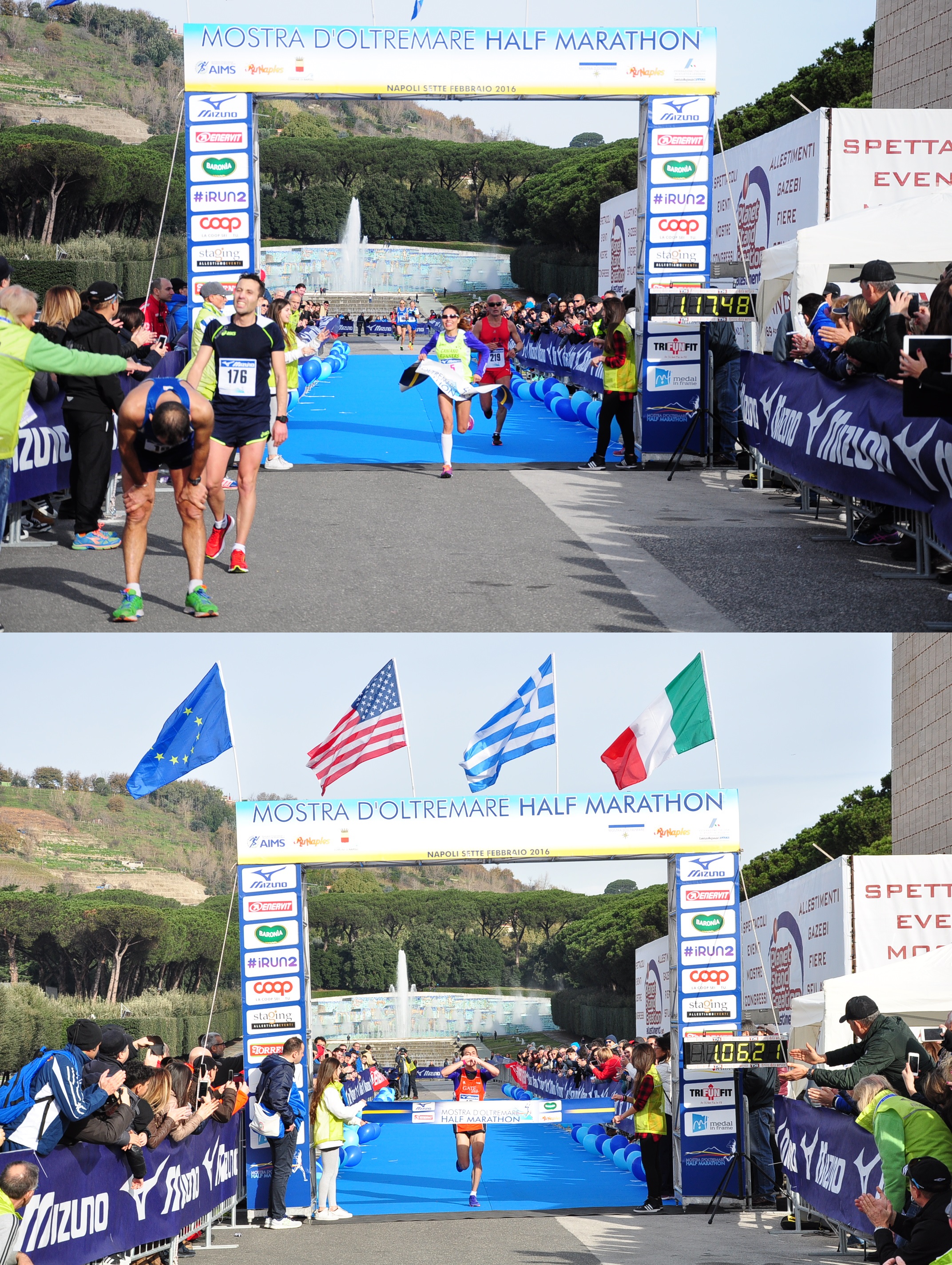 buon servizio, da parte della polizia comunale di Napoli , che hanno fatto si che il tutto ,sia andato alla meraviglia e nessuno ad intralciare la corsa dei 3000 e coloratissimi runners.Tanti sono venuti da tutta la penisola e isole e anche dall’estero, tra questi ..i cinesi !La vittoria è andata all’atleta abbruzzese Daniele D’Onofrio della Nuova Atletica Isernia ,che si è presenato,tutto solo all’interno della Mostra d’Oltremare , zona d’arrivo e con la magnifica scenografia alle sue spalle dei giardini e della Fontana Esedra della Mostra ,con il tempo finale di 1h06’21”.davanti a Gilio Iannone , della International Security Service e Paolo Ciappa del Cus Camerino , con i seguemti tempi finali ; 1h08’29” e 1h08’44”. Tra le donne la palma della vittoria è andata , alla forte atleta magrebina , Malika Ben Lafrik ,che corre con i colori campani della Caivano Runners , che ha fermato il cronometro a 1h17’48” , seguire per concludere il podio in rosa, l’atleta Loredana Brusciano dell’Arca Atletica Aversa A.Aversano , a 6 minuti e Fabiola Desiderio del Team Atletica Uisp a 8 minuti e 33 secondi dalla vincitrice .L’evento che ha visto ,la presenza del primo cittadino e dell’assessore allo sport del comune di Napoli , oltre al presidente dell’Ente Mostra D’Oltremare e dell’organizzatore ,tra le piu’ grandi e famose maratone in Europa , la Prague International ! Gli organizzatori , della gara ,la RunNaples ,presidente Benny Scarpellino , che sono stati premiati recentemente con “La Transenna ” come miglior gara dell’anno 2015 in campania , hanno dimostrato di averlo meritato e a pieni voti .Alla fine , commenti a fine gara , hanno premiato il grande sforzo organizzativo degli uomini e donne della macchina organizzativa e dopo questa bellissima edizione che la proietta , fuori dalle mura dei grandi eventi in Italia e va oltre i confini. Un appello ,va ai tanti napoletani , che non hanno un buon rapporto con il podismo in città , di collaborare e di partecipare a questi eventi podistici ,anche in vesti di pubblico ,che in altre città e con questi numeri e organizzazione, ne fanno una vetrina della loro città e ne vanno orgogliosi ,di vederla …correre tra le strade della loro città !