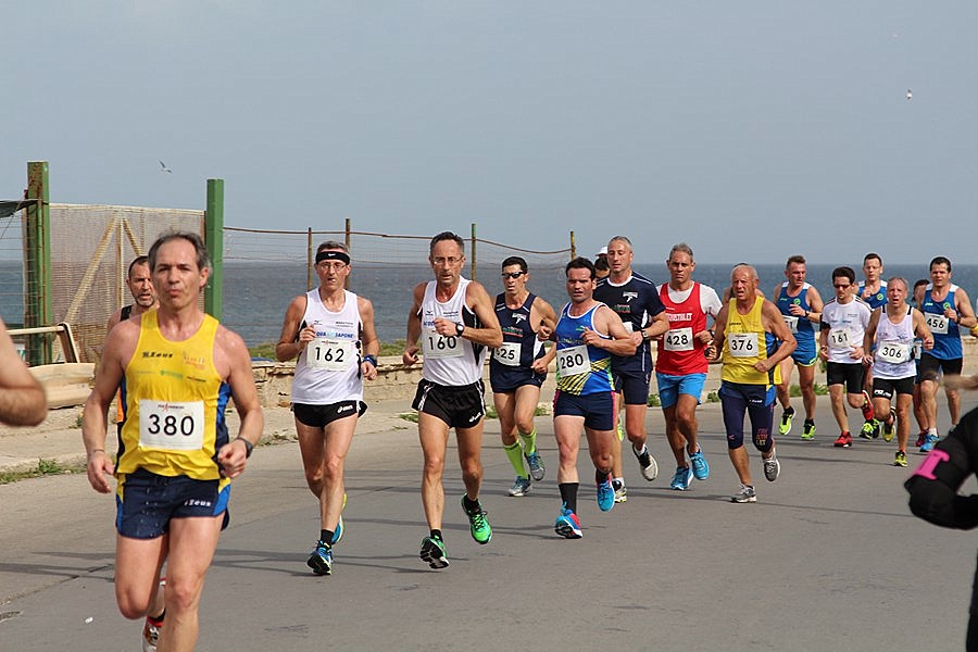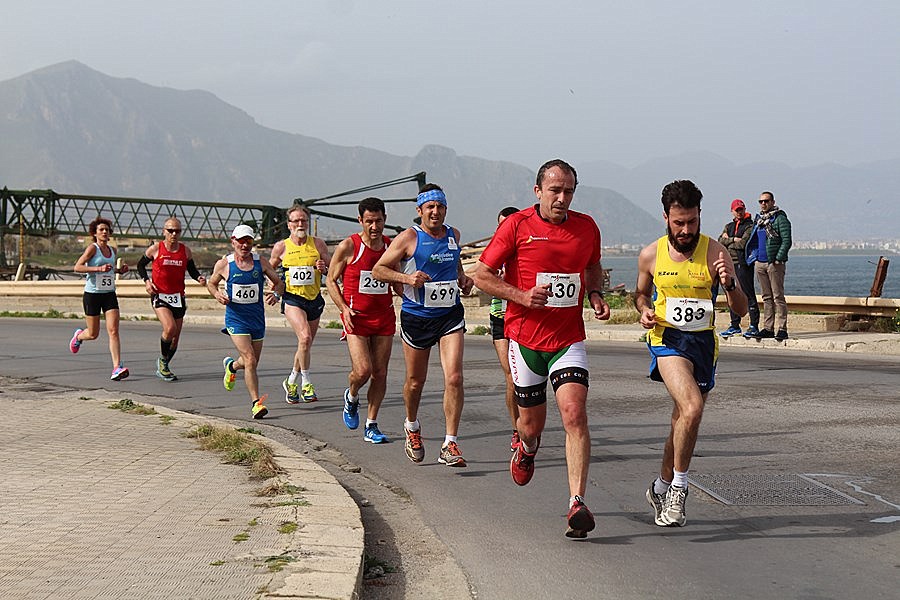 Carmelo Torrisi (Podistica Jonia Giarre), “re” delle partenze veloci e seguo la scia di Angelo Numa (Podistica Jonia Giarre), ma all’anagrafe ci dividono 10 anni e fanno la differenza, è così lo vedo allontanarsi. Arrivo al primo giro di boa che affronto con il mio stile: allargo tutto a destra e poi stringo a sinistra sulla transenna come se fossi una “bolide” della Formula Uno. La ripresa in senso contrario però non somiglia per nulla alla Ferrari o alla McLaren, anzi rallento e dopo poco sopraggiunge “l’amico avversario“ Salvatore Cammarata”. Mi chiama, ha un altro passo, è sulla scia di “veri giovani” dello “Sportamatori Partinico” ai quali precisa che lui è un “giovane SM60”. Io mi aggancio, è un buon traino, ma non so quanto potrò resistere. Completiamo il primo giro, siamo nuovamente in direzione ovest, il vento rinforza o forse è la fatica che ci dà questa sensazione. Incrociamo i primissimi, Alessio Terrasi “Fiamma Rossa Palermo” è nettamente in testa, non ha avversari, anche Barbara Bennici “Fiamma Rossa Palermo” è in compagnia “solo maschile”. Incrociamo anche Raffaele Santoddì, il migliore fino a ieri di noi “giovani SM60”, ma oggi però è in evidente difficoltà, va di passo, forse pensa al ritiro. Siamo al secondo giro di boa, è metà gara. Cammarata dopo avere moderato la velocità, in assenza di salite dove abitualmente forza l’andatura, inizia a farlo ogni 400, 500 metri. Io fatico sempre di più. Dall’altro lato, in risalita osservo l’amico Luciano Costarella (Virtus Acireale), che viaggia allegramente e lentamente, forse oggi si è preso un “giorno di ferie”, dopo il “quasi podio” al Trofeo Carnevale di Acireale. Vedo anche Pietro Giovenco (Amatori Palermo) di professione “Cantastorie”, del