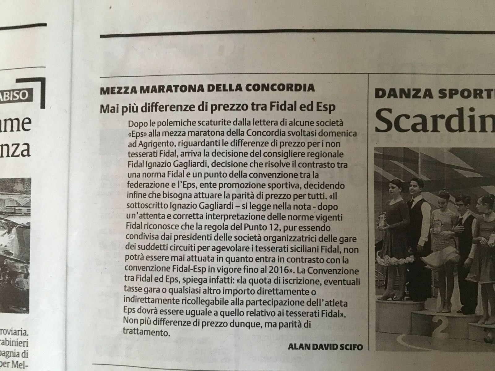di quota d’iscrizione tra Eps e atleti Fidal alla Mezza maratona della Concordia di domenica scorsa (vicenda nata da una “lettera aperta” a firma di cinque società dell’agrigentino). Nell’articolo de La Sicilia edizione Agrigento a firma Alan David Scifo, infatti si parla di “decisioni” prese da Gagliardi all’indomani dei fatti di Agrigento. Il responsabile del settore amatoriale della Fidal Sicilia Ignazio Gagliardi sottolinea in una nota la sua totale estreneità ai fatti e alle circostanze citate dal giornalista, con tanto di virgolettato nell’articolo “incriminato”. Gagliardi, oltre a chiedere l’immediata rettifica, ha preannunciato la possibilità di adire per vie legali.