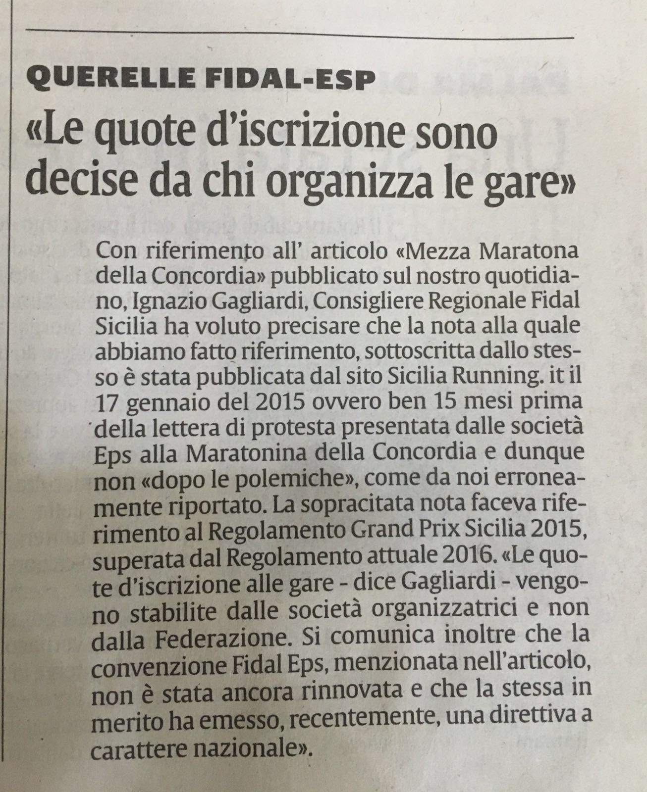 La rettifica ed il conseguente passo-indietro che stamane il quotidiano La Sicilia edizione di Agrigento ha fatto pubblicando un articolo di smentite, dovrebbe chiudere la querelle tra Eps e organizzatori della maratonina di Agrigento nata da una lettera di rimostranze a firma di cinque società agrigentine che lamentavano la disparità di trattamento nella quota d’iscrizione alla gara di domenica scorsa, tra tesserati Fidal e tesserati con un ente di promozione sportiva (VAI AL LINK). L’articolo “incriminato” (LO RIPORTIAMO IN BASSO INSIEME A QUELLO PUBBLICATO OGGI) aveva riportato una dichiarazione con tanto di virgolettato del consigliere regionale della Fidal, Ignazio Gagliardi, dichiarazione mai rilasciata dallo stesso. Da qui la richiesta di rettifica, giunta stamane con un articolo non firmato, nel quale (dunque non si sa chi) scrive di un errore del giornalista nato da una nota presente sul nostro sito e “vecchia” di 15 mesi. Strano errore, da principianti se fatto in buona fede, in quanto la nota dalla quale è stata estrapolata la dichiarazione di Gagliardi, essendo datata 17 gennaio 2015 non si trova più nella nostra home page ma ormai archiviata e rintracciabile dietro accurata ed esplicita ricerca. Un virgolettato trasportato nel futuro e “affibbiato” ad una polemica; benzina sul fuoco per una vicenda che poteva chiudersi prima e senza antipatici strascichi Di questo chi ne esce più malconcio è il consigliere Gagliardi che, senza alcun tipo di dichiarazione resa, è stato oggetto di critiche infondate.