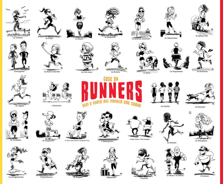 Al suo interno, infatti, sono presenti, 100 profili di runner, dei veri e propri identikit ironici e originali, con relative illustrazioni, con le quali potersi identificare e ritrovare i propri amici e compagni di corsa, in alcuni casi unendo anche più profili. Tra questi: il Forsennato pronto a dare consigli, la stratega Complessata, l’attrezzato Full Optional, il goffo the Monkey, l’Audiodopato con l’immancabile mp3, l’accompagnato Seizampe, il Run-ziano a cui tutti aspiriamo diventare con gli anni, il “volta pagina dell’alimentazione” Tanosuke , lo stratificato Mr.Onion, il Salve Salvino che saluta sempre e in ogni caso, l’Ipertrofico che ritroviamo nella copertina del libro, con muscoli in evidenza e super accessoriato, la Selfie Addicted con il sorriso da postare ovunque, la Modella Americana che rigenera per magia anche chi è ormai sfinito, immancabile il Tapascione che rappresenta l’amatore per antonomasia, ed ancora tanti altri: la Trasognata, l’Improbabile, l’Oversize, il Rocky, i Bla Bla Blanners, lo Spanciatoil Traino, la Run-Ziana, ed ancora l’Imboscato, il Sensodicolpista, il Roccia, l’Idrofobico, il Periscopio, il Piacione, l’Ipocondriaca, il Gufo, la Carogna, la Bionica, la Sofi(Ga)Stigata, l’Anonimo, la Bella e la Bestia, l’Anfibio, l’Arrampicar, l’Espertina, lo Sconocchiato, , l’Inossidabile, la Vegana, il Barbapapà, la Scotchata, il Birramaniaco, il Rapportista, la Pettegola, il Robottino, lo Scaciato, il Muto, il Fenomeno, i Naturisti, Ginger Cream and Fred Lasagna, i Garminators, il Coach, il Nero, Cavallo Alto, l’Insetto, , il Diesel, il Demoniaco, l’Ex Body Builder, l’Ex Ciclista, l’Ex Calciatore, la Fangosa, il solo chiacchiere e frequenzimetro, La solo chiacchiere e scarpette Fluo, la Pantera, il Rambo, la Campionessa, il Daitarn, il Filosofo, il Vampiro, il Vecchio Leone, la Speedy Mum, la Giapponese, i Poliziotti, il Maratoneta, gli Hipster, lo Zombie, il Big Jim, l’Accoppiato, il Wurstel, la Margiotta, il Gallowayano, i Cipolloni, le Cipolle, il Sub, l’Actarus, l’Hiroshi, il Luciotto, il Lama, lo Schiacciaformiche, il Fulminato, il Cammello, l’Arbitro, Josimar, la Ninja, il Discoboy, la Poetessa, il Tergicristallo.