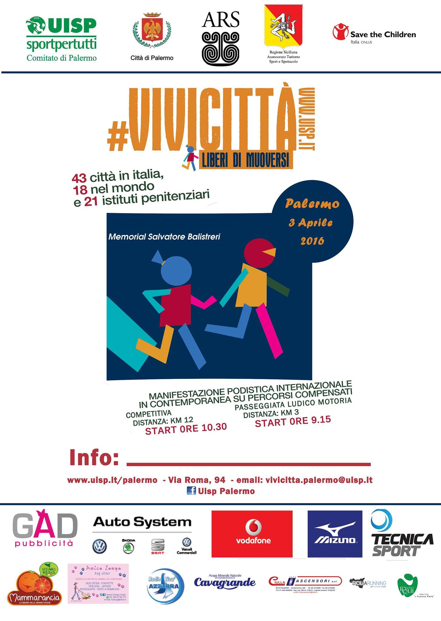 Uisp Palermo, rende noto che il ritiro dei pettorali e dei chip (per la competitiva) avverrà presso il Village del giardino Inglese giorno 2 aprile dalle 15 alle 19 e il 3 aprile (giorno della gara) dalle 7.30 alle 9.30.