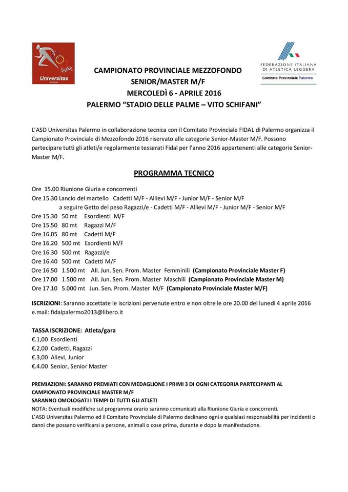 Palermo. L’ASD Universitas Palermo, in collaborazione con la Fidal Palermo organizza il 6 aprile 2016 il Campionato provinciale di mezzofondo Senior/Master M/F. La manifestazione si svolgerà presso lo stadio delle Palme – Vito Schifani e sarà preceduta da alcune prove che vedranno protagoniste le categorie giovanili. A seguire Allievi, Juniores, Senior, Promosse, Master M/F saranno impegnati nei 1500. Successivamente si disputeranno i 5000 metri (Juniores, Senior, Promosse, Master M/F)