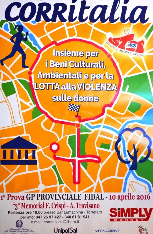 La denominazione completa dell’evento è “Corritalia – Insieme per i Beni Culturali Ambientali e per la lotta alla violenza sulle donne”. Obiettivo dell’iniziativa è unire idealmente l’impegno per lo sviluppo dello sport praticato con la tutela del patrimonio storico, culturale e paesaggistico italiano. Si correrà su un percorso completamente pianeggiante di circa 7.8 km (giro unico), con ritrovo giuria e concorrenti fissato alle ore 9 e partenza, che verrà data alle 10,
