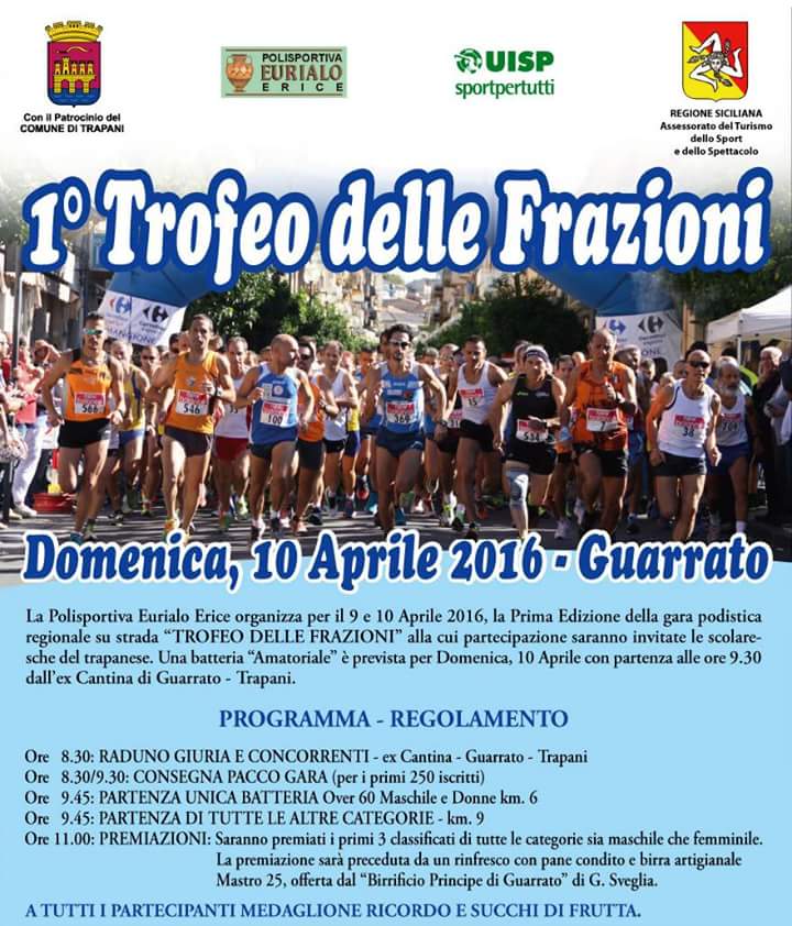 La Polisportiva Eurialo Erice organizza per domenica 10 aprile 2016 la 1a edizione della gara podistica regionale su strada “Trofeo delle Frazioni”. Alla gara possono partecipare tutti gli atleti regolarmente tesserati alla FIDAL o ad altro Ente di Promozione Sportiva, riconosciuto dal Coni, in regola con le vigenti norme per la tutela sanitaria per la pratica dell’Atletica Leggera agonistica per l’anno 2016.