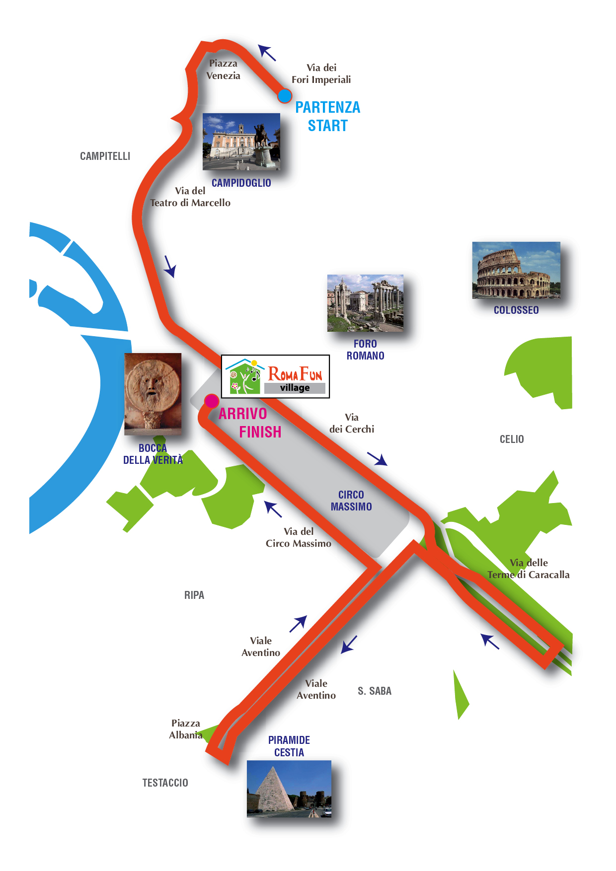 Il percorso, infatti, conquista il cuore della Roma imperiale. La partenza sarà al seguito della maratona, dunque sempre da via dei Fori Imperiali, poi per 1,5 chilometri segue il tracciato della gara passando accanto al Teatro di Marcello, Bocca della Verità e costeggiando il Circo Massimo. Continua per i rettilinei di via delle Terme di Caracalla, rientrando sul percorso di maratona fino a lambire Porta San Paolo e Piramide, per poi tornare nel centro storico nel tratto finale con l’arrivo all’interno del Circo Massimo. Luogo di arrivo dove sarà allestito il Roma Fun Village (ingresso gratuito), un villaggio che offrirà animazione, attività sportive e ludico-ricreative per tutti.