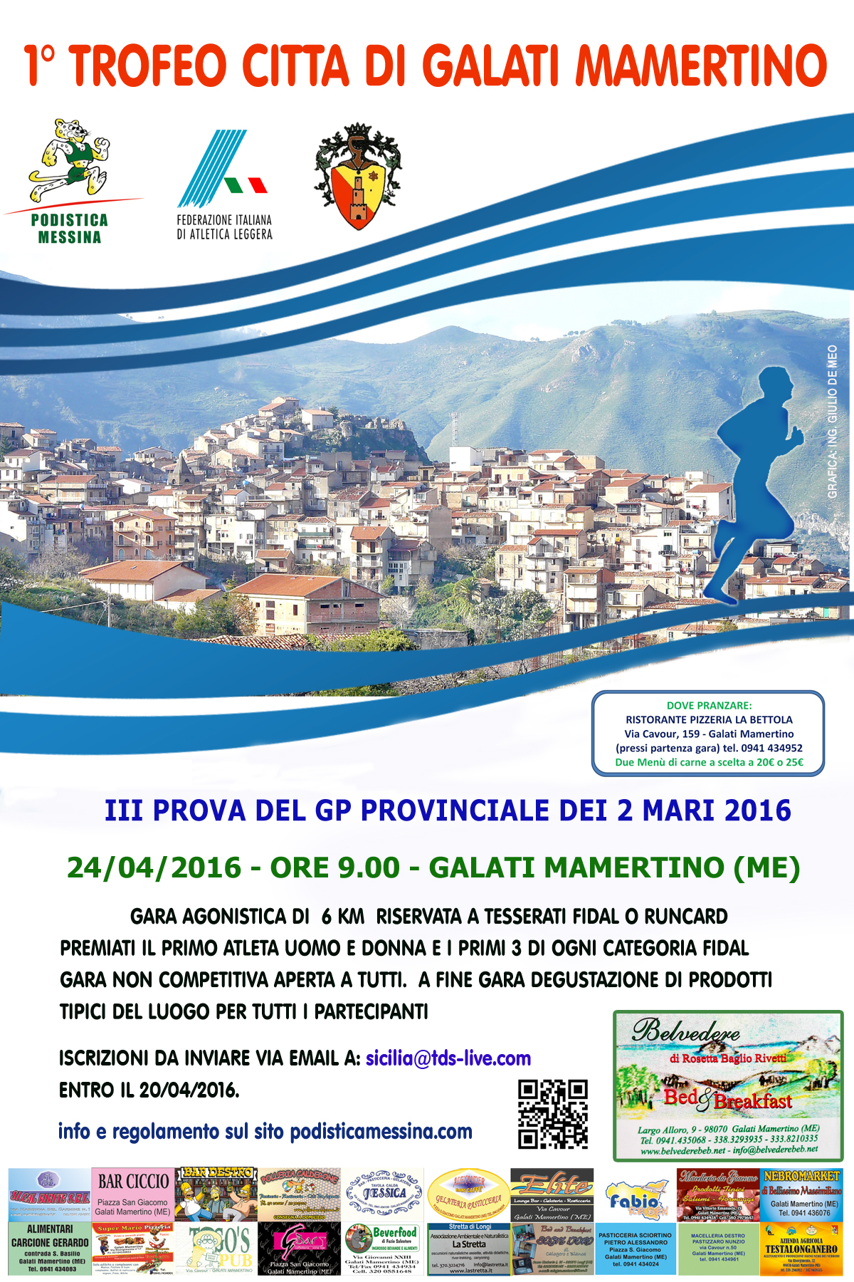 Domenica 24 aprile 2016 si corre a Galati Mamertino (ME), la manifestazione podistica intitolata “1° Trofeo Città di Galati Mamertino”,gara valida come III prova del Grand Prix Provinciale dei 2
