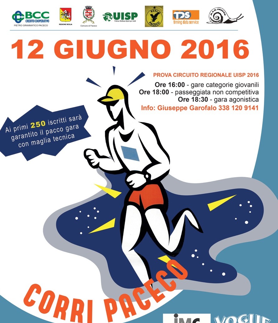 Paceo (TP). Il prossimo 12 giugno è in programma la Corri Paceco, prova del circuito regionale Uisp. Ai primi 250 iscritti l’organizzazione garantirà il pacco gara con la maglia tecnica. Cronometraggio garantito dalla TDS.