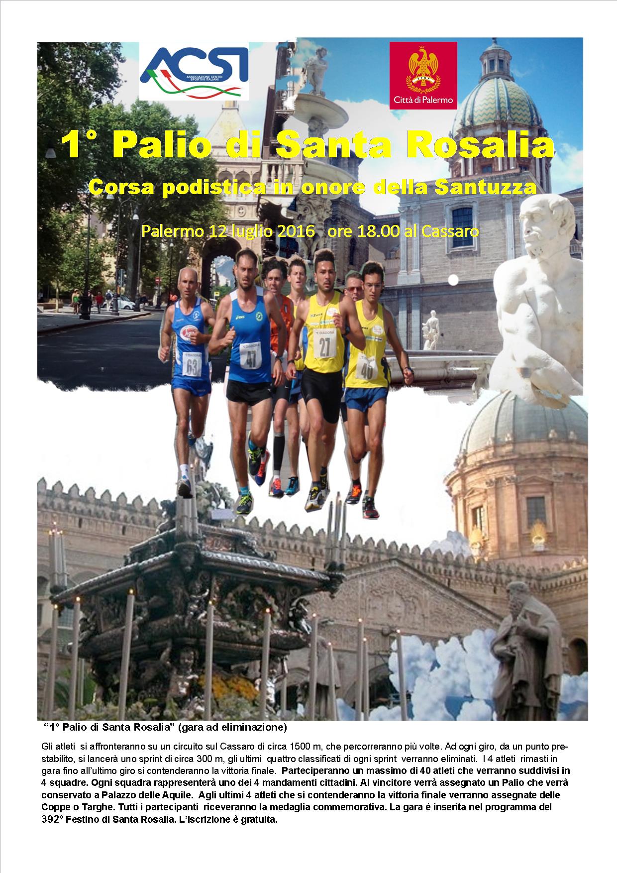Palermo. La delegazione ACSI Sicilia Occidentale in collaborazione col Comune di Palermo organizza il “1° Palio di Santa Rosalia” corsa ad eliminazione in Onore della Santuzza inserita nei festeggiamenti del 392° Festino di Santa Rosalia.