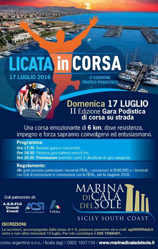Licata (Ag). Si svolgerà domenica prossima 17 Luglio alle ore 19 la 2° edizione della manifestazione podistica denominata Licata in corsa trofeo Marina di Cala del Sole in programma a Licata all’interno del Porto Turistico.