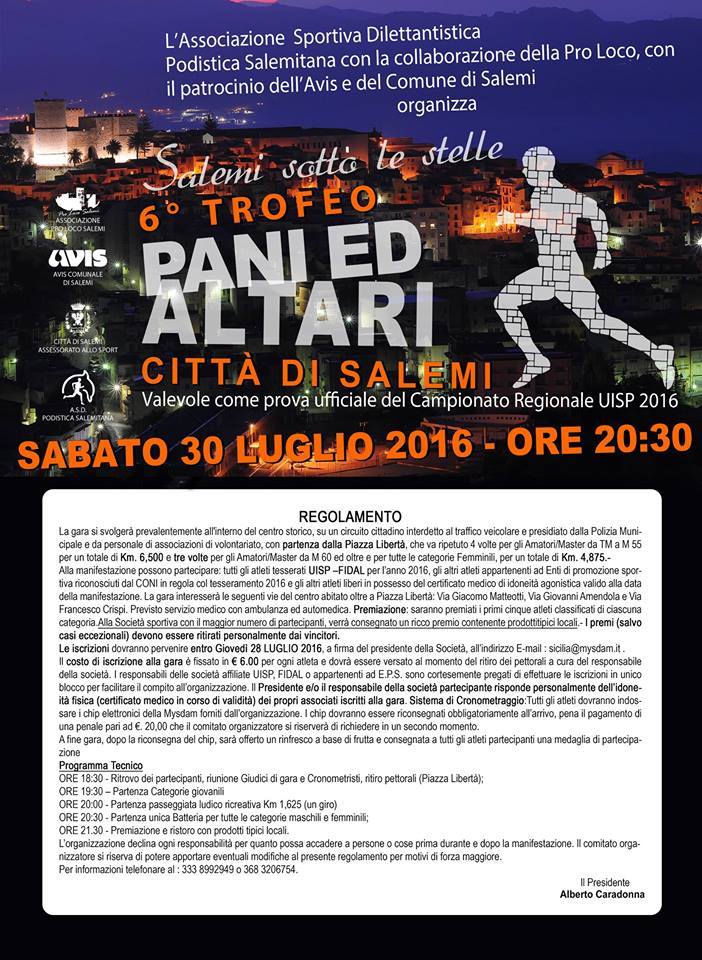Salemi (Tp). In programma sabato 30 luglio la sesta edizione di Salemi sotto le Stelle – 6° Trofeo Pani ed Altari Città di Salemi. La manifestazione, valida come prova ufficiale del campionato regionale Uisp 2016, è organizzata dall’ASD Podistica Salemitana con la collaborazione della Pro Loco, con il patrocinio dell’Avis e del Comune di Salemi.