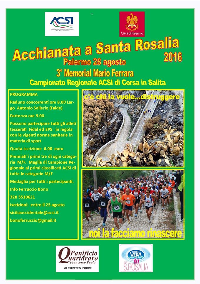 La Delegazione Metropolitana ACSI Sicilia Occidentale in coorganizzazione col Comune di Palermo organizza la “L’ Acchianata a Santa Rosalia 2016”. La gara, valida come Campionato Regionale ACSI di Corsa in Salita, avrà luogo a Palermo domenica 28 agosto e assegnerà le maglie di Campione regionale Acsi di corsa in salita