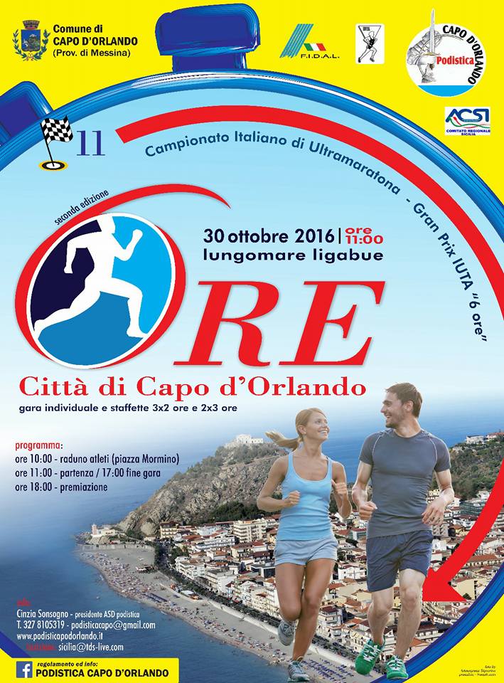 Ultramaratona, in programma il 30 ottobre 2016L ‘ASD PODISTICA CAPO D’ORLANDO, dopo la prima edizione che ha visto la partecipazione di nomi illustri come l’attuale campione del mondo sui 100 km GIORGIO CALCATERRA, è lieta di comunicare l’evento dell’anno nel panorama del podismo sul territorio nazionale, la ” 6 ore Città di CAPO D’ORLANDO”, competizione inserita nel calendario IUTA.