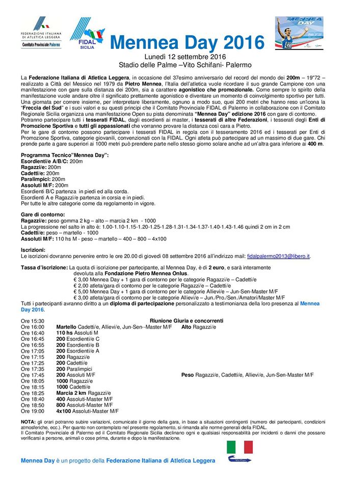 di Pietro Mennea. 200 metri in cui il significato agonistico viene messo in secondo piano: tutti infatti, potranno correre il mezzo giro di pista, con ogni passo, manifestando così, con la propria presenza, l’adesione a quei valori sportivi che Mennea seppe legare in modo inscindibile al proprio nome: l’integrità e la dedizione, il rispetto di se stesso e degli avversari. Palermo ancora una volta risponde presente a questo “tributo” con una manifestazione, in programma lunedì 12 settembre, che vedrà protagonisti allo stadio delle Palme – Vito Schifani, proprio tutti: dalle categorie Esordienti, fino agli Assoluti e i master, passando dagli Esordienti, Ragazzi, Cadetti e gli atleti paralimpici. Non solo i 200 metri, ma anche gare di contorno per una giornata di festa e di sport. Anche a Palermo, così come nelle altre città italiane che ospiteranno il Mennea Day, la cifra d’iscrizione, di appena due euro, verrà interamente devoluta alla Fondazione Pietro Mennea Onlus, voluta dalla “Freccia del Sud” ed impegnata in iniziative di solidarietà sociale. Al Vito Schifani di Palermo il pomeriggio di sport inizierà alle 15.30. In Sicilia, oltre a Palermo, il Mennea day si svolgerà a Misterbianco, nella pista di atletica che porta il nome proprio i Pietro Mennea.