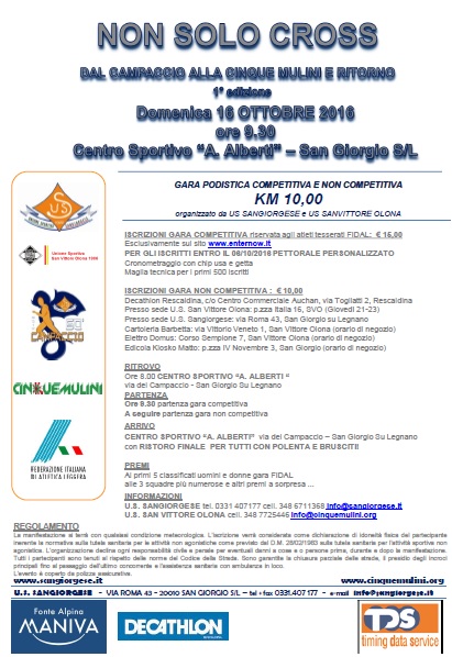 Unione Sportiva Sangiorgse e Unione Sportiva San Vittore Olona si uniscono per organizzare questa 10km competitiva e ludico motoria dove tutti, davvero tutti, potranno partecipare. Il percorso è semplice: dal Campaccio alla Cinque Mulini e ritorno, da San Giorgio a San Vittore, dallo Stadio Alberti ai Mulini e ritorno. Quest’anno sarà così, l’anno prossimo è già previsto sarà il contrario. Partenza da San Vittore e giro di boa allo stadio di San Giorgio su Legnano.