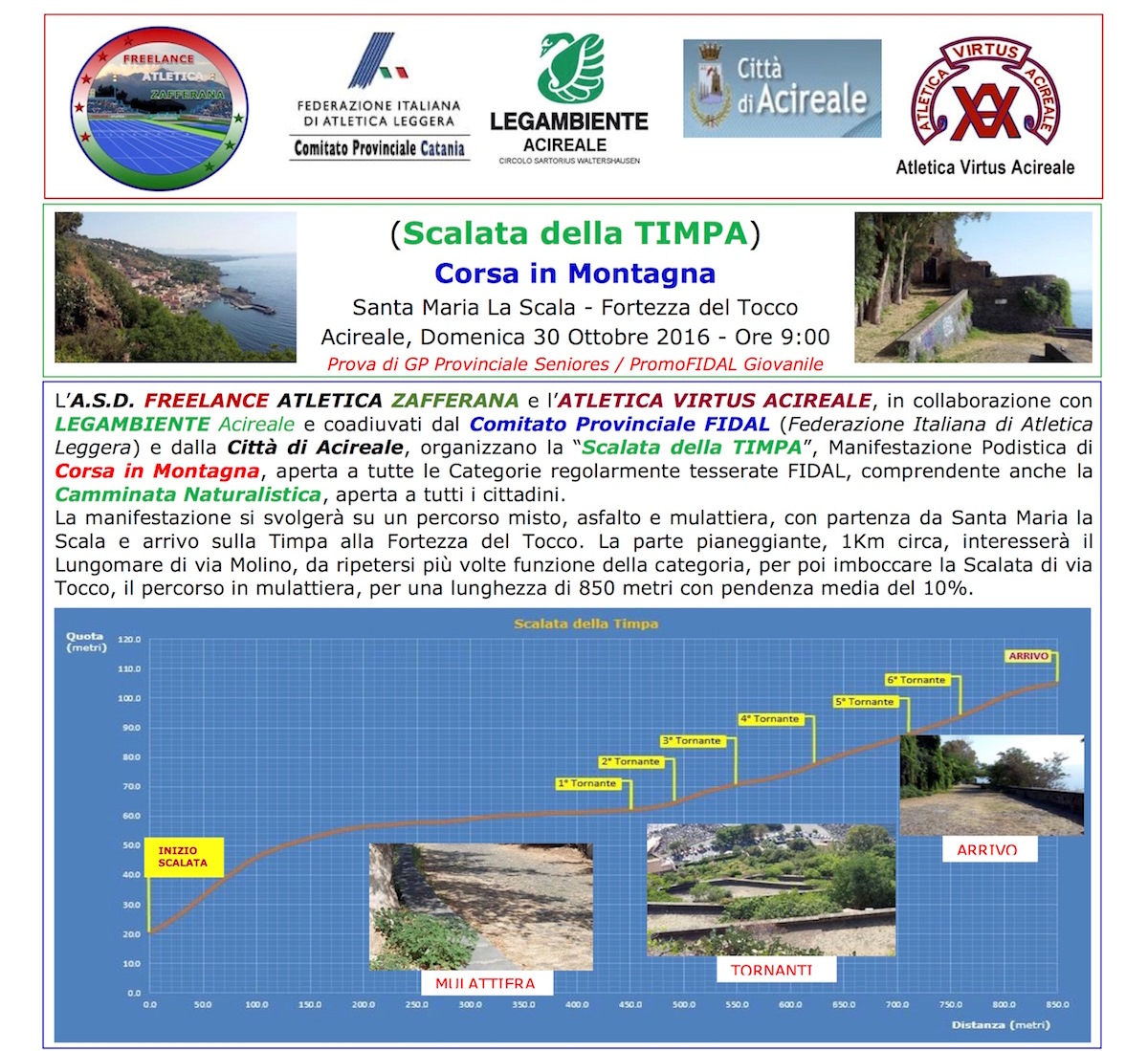 L’A.S.D. FREELANCE ATLETICA ZAFFERANA e l’ATLETICA VIRTUS ACIREALE, in collaborazione con LEGAMBIENTE Acireale, coadiuvati dal Comitato Provinciale FIDAL (Federazione Italiana di Atletica Leggera), dal GGG “Pistritto” di Catania e dalla Città di Acireale, organizzano per la giornata di domenica 30 ottobre, la “Scalata della TIMPA”. La manifestazione podistica è valida come Campionato Provinciale FIDAL di Corsa in Montagna ed è aperta a tutte le Categorie regolarmente tesserate FIDAL, EPS e RUNCARD: Insieme alla parte agonistica è prevista la Passeggiata Naturalistica, aperta a tutti, appassionati e cittadini.