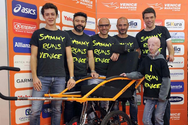 Alla partenza della 42 km ci sarà anche Sammy Basso, fondatore dell’Associazione Italiana Progeria, che correrà assieme ad un gruppo di amici podisti con una speciale carrozzina, la Joelette. Saranno in 21 i runners che, a turno, spingeranno Sammy verso il traguardo. “Sarà divertente correre, non vedo l’ora – le parole di Sammy Basso – ho già pronta la telecamera portatile perché non voglio perdermi un solo metro del percorso. La vendita via Facebook delle maglie ‘Sammy Runs Venice’ è andata molto bene, e spero che tanti altri soldi possano arrivare per finanziare i progressi nella ricerca sulla progeria, malattia che provoca l’invecchiamento precoce dei tessuti. Sarà una gran bella esperienza, anche perché quando sei con gli amici che ti sostengono, la disabilità non conta più”.