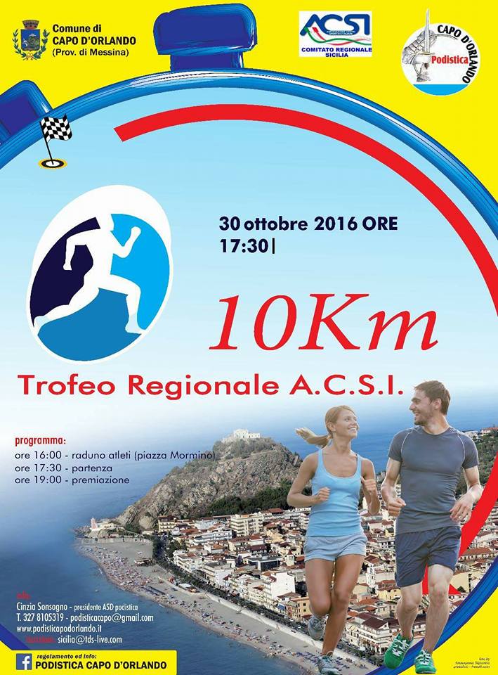 Campione Regionale ACSI di Categoria. La gara sulla distanza di 10 km partirà alle ore 17,30 e si svilupperà su un circuito di due chilometri che sarà ripetuto cinque volte da tutte le categorie. I tesserati regionali ACSI all’atto dell’iscrizione dovranno presentare regolare tessera associativa e riceveranno dal Comitato Organizzatore della ASD Podistica Capo D’Orlando un ricco pacco gara ed al termine della fase agonistica una splendida medaglia ricordo della manifestazione.