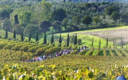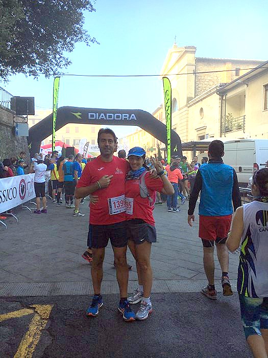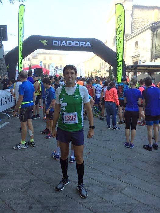 Sabato mattina abbiamo ritirato il nostro pacco gara nel delizioso borgo di Castelnuovo Berardenga, ricco di stand e localini aperti per l’occasione. Cinquemila i partecipanti divisi tra 42km, 21km e passeggiate- degustazione. Atleti, famiglie, turisti hanno letteralmente invaso le vie del paesino godendo di uno scenario meraviglioso e dell’ottimo cibo. La mattina della gara – che dire – emozione alle stelle. I colori del Chianti lasciano davvero senza fiato. Alla partenza, ad accoglierti, un’aria fresca e un vialone ricco di querce e abeti. Runners in preparazione, zainetti volanti, borracce in mano e bacchette colorate ma senza quell’ansia da prestazione che troppo spesso ho notato durante le gare su strada. Ho vissuto sorrisi, serenità, divertimento senza l’ossessione del cronometro. Alle 9.30 tutti pronti. Diversa la partenza per gli iscritti alla maratona con lo start dal suggestivo Castello di Brolio. Prima del via una preghiera e un abbraccio ai miei compagni di gara e di avventure, Giacinto Pipitone e Carmelo Lopapa. Poi la corsa da piazza Marconi: in discesa per i primi tre chilometri sulla strada asfaltata per ammirare a sinistra le Crete Senesi, il profilo di Siena e sulla destra le colline del Chianti. Dopo il terzo chilometro, attraversando i vigneti, si è raggiunto un agriturismo e il primo ristoro (sono cinque in totale e l’impeccabile organizzazione offre proprio di tutto: acqua, vino, frutta, sali minerali e bruschette). Subito dopo una strada bianca all’interno del bosco in salita per 2km che ha condotto nel cuore del Chianti tra felci, ginepri e fiori profumati. (ba.ca)Amo il vino, adoro le bistecche. L’ho pensato ogni volta che affrontavo una salita: “Faccio questa per meritarmi un bicchiere in più stasera e una fiorentina più grossa”. Quelle salite, sempre più insistenti dall’ottavo chilometro, mi attiravano però ogni volta di più. Ce n’era una, al 14esimo, che andava dritta dritta verso il cielo: un viale cipressato con il selciato bianco e una nebbiolina che non lasciava intravedere la fine della strada. Incredibile, correvo senza sapere verso dove.