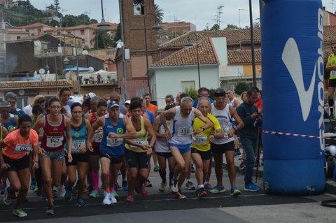 Ore 9e30. È il momento della partenza. Come spesso accade, la batteria comprende “anziani” oltre i “sessanta” e l’altra metà del cielo. Uomini e donne dunque, ma non in contrapposizione, ma in simpatica “miscellanea”. Da Sossio Farina, ultraottantenne, alle allieve presenti che potrebbero essere le sue nipoti. Michelangelo Granata sfodera la pistola e con un colpo ci dà l’OK per scappare via. La passeggiata sul lungomare, da preliminare di riscaldamento diviene agonistica. Più rapida di tutti alla partenza è proprio un’allieva, Daria Bonfiglio (Atl. Virtus Acireale), che sembra prendere subito la cosa sul serio e allunga notevolmente il passo. Sulla sua scia Patrizia Strazzeri (Atl. Fortitudo Catania), la favorita fra tutte le donne in corsa. Daria preme sull’acceleratore, io corro “al risparmio” pensando alla “salitella” delle Chiazzette” che ci attende dopo i tre giri di “passeggiata a mare” e la lascio andare. Patrizia sembra più determinata di me, va all’inseguimento di Daria e lentamente le vedo allontanarsi. Siamo al secondo giro, mi affianca Santi Caniglia (Atl. Scordia), penso che il mio correre al “risparmio” è forse eccessivo e allungo il passo. Al secondo passaggio dal gonfiabile Daria è ancora più distante, ha preso anche qualche altro metro a Patrizia. Ma al terzo giro la musica fra le due femminucce cambia. Daria, forse troppo veloce in partenza, rallenta vistosamente e all’imbocco della temuta salita, Patrizia l’aggancia. Io mi godo lo spettacolo a una diecina di secondi e anch’io imbocco la mulattiera che ci porta al “Tocco”. Dopo dieci metri di asfalto, inizia un basolato molto “approssimativo”, ci sono buche, qualche tratto è con cemento, veramente difficile correrci sopra. Rimpiango i percorsi che abbiamo criticato durante molte prove di questo Grand Prix 2016. Ma siamo alla “corsa in montagna” e dobbiamo “digerire” qualche difficoltà extra.