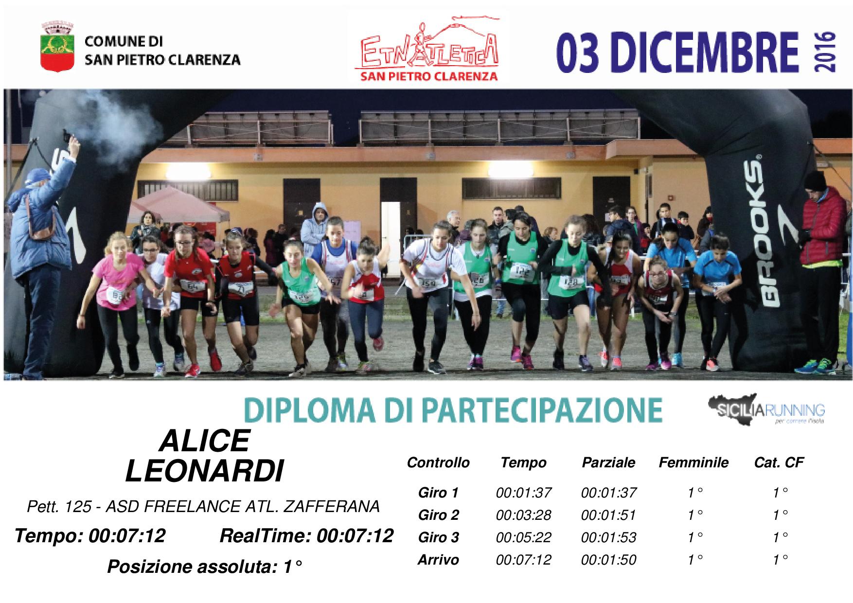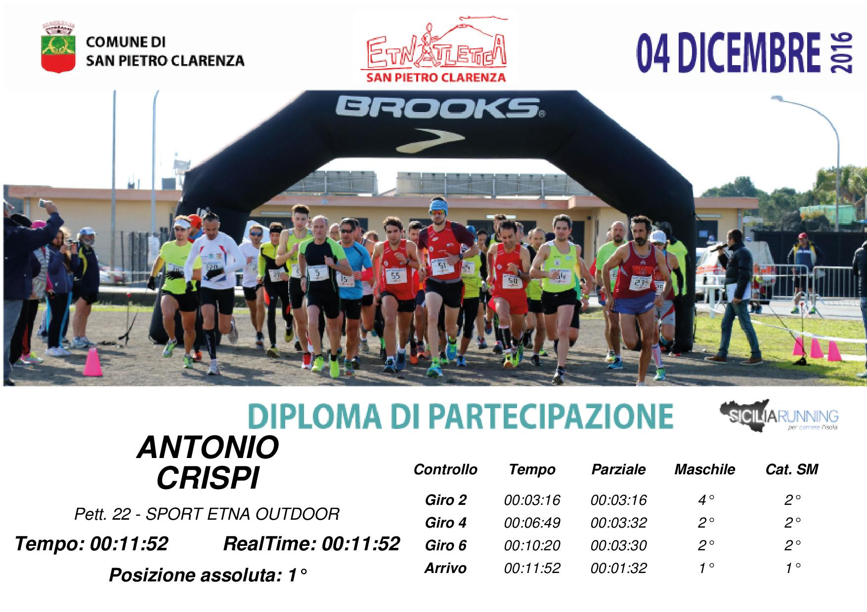 settimana a San Pietro Clarenza. La manifestazione è stata indetta dal Comitato provinciale della FIDAL di Catania e organizzata dall’A.S.D. Etnatletica S. P. Clarenza, con il patrocinio del Comune di San Pietro Clarenza e la collaborazione del GGG “V. Pistritto”. Prosegue dunque anche “al di fuori” delle gare del GP, la felice sinergia tra la TDS (Timing Data Service) e Siciliarunning che offrono così agli atleti un “prezioso” ricordo che, oltre a contenere timing, passaggi e posizione, ha come layout la foto della gara, la più rappresentativa, la partenza che coinvolge tutti,
