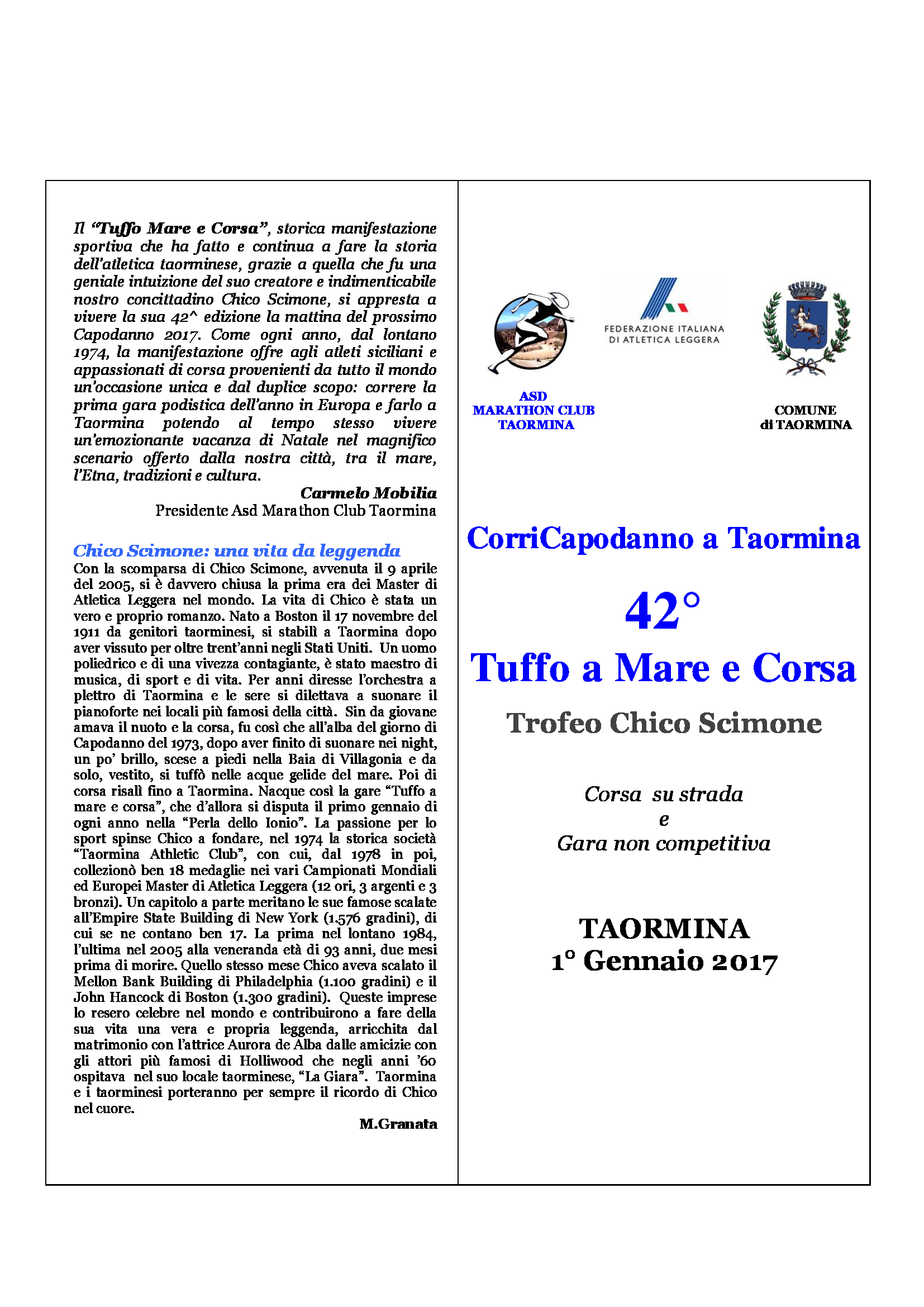 L’uno gennaio del 2017, si festeggia l’Anno Nuovo con il “CorriCapodanno a Taormina” – Trofeo Chico Scimone – 42° «Tuffo a mare e corsa», organizzato dall’Asd Marathon Club Taormina di Carmelo Mobilia. Il regolamento della storica gara; a seguire riproponiamo un accurato e prezioso ritratto di Chico Scimone (a cura di Michelangelo Granata) e di come, quasi per caso, nacque la manifestazione…