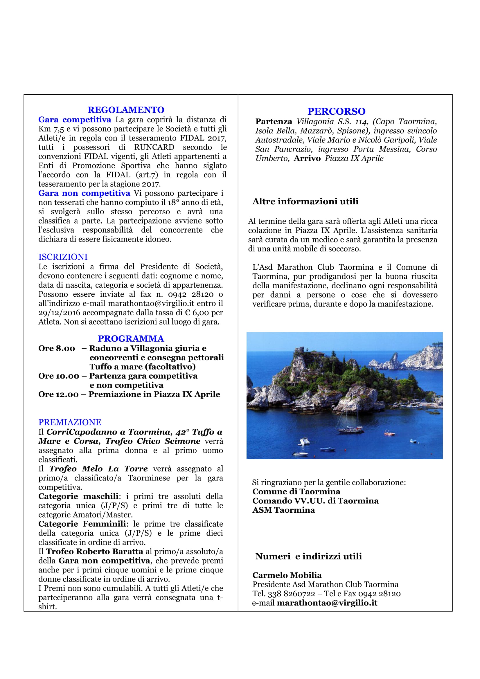 L’Associazione Sportiva Dilettantistica Marathon Club Taormina con il patrocinio del Comune di Taormina, sotto l’egida del Comitato provinciale FIDAL di Messina ed il controllo del Gruppo Giudici di Gara di Messina, organizza il “CorriCapodanno a Taormina” 42° Tuffo a Mare e Corsa Trofeo Chico Scimone, gara su strada. In palio anche il Trofeo Melo La Torre che verrà assegnato al primo/a taorminese della gara competitiva, mentre il Trofeo Roberto Baratta (atleta poliedrico taorminese scomparso tragicamente nell’agosto del 2015) verrà assegnato al primi/a assoluto/a della gara Non competitiva.