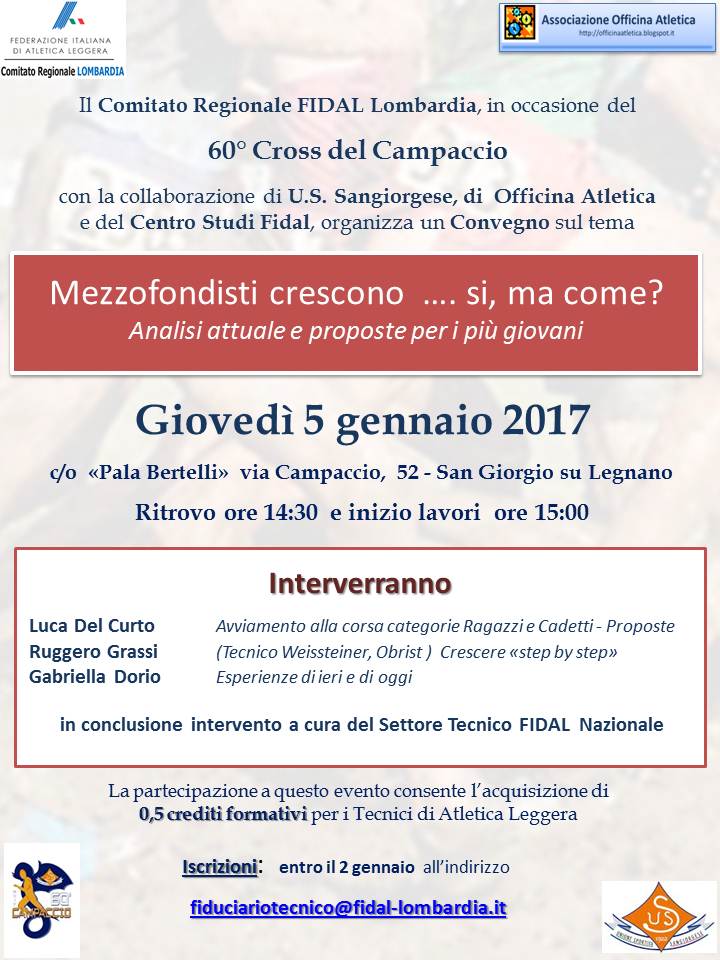 CONVEGNO – Come da tradizione il 5 Gennaio, giorno della vigilia del Campaccio, si svolgerà un Convegno dedicato ad atleti, tecnici e dirigenti organizzato da Associazione Officina Atletica in collaborazione con U.s. Sangiorgese ed il Centro Studi Fidal.