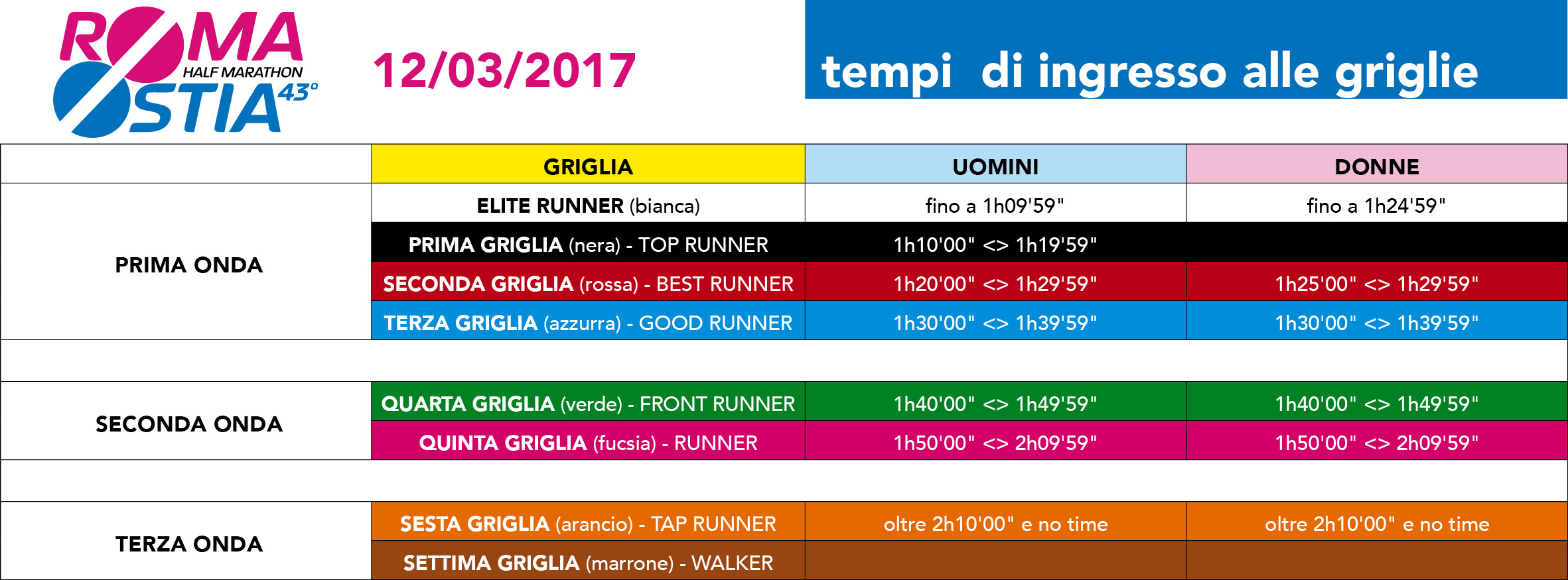 La Romaostia vuole essere da sempre una gara competitiva: una gara nella quale si corre per ottenere il personal best, per battere il compagno di allenamento, per “fare il tempo”. E’ per questo che gli organizzatori sono attenti a permettere a ciascun atleta di partire nella griglia giusta, insieme a chi ha tempi vicini ai propri e che correrà agli stessi ritmi.