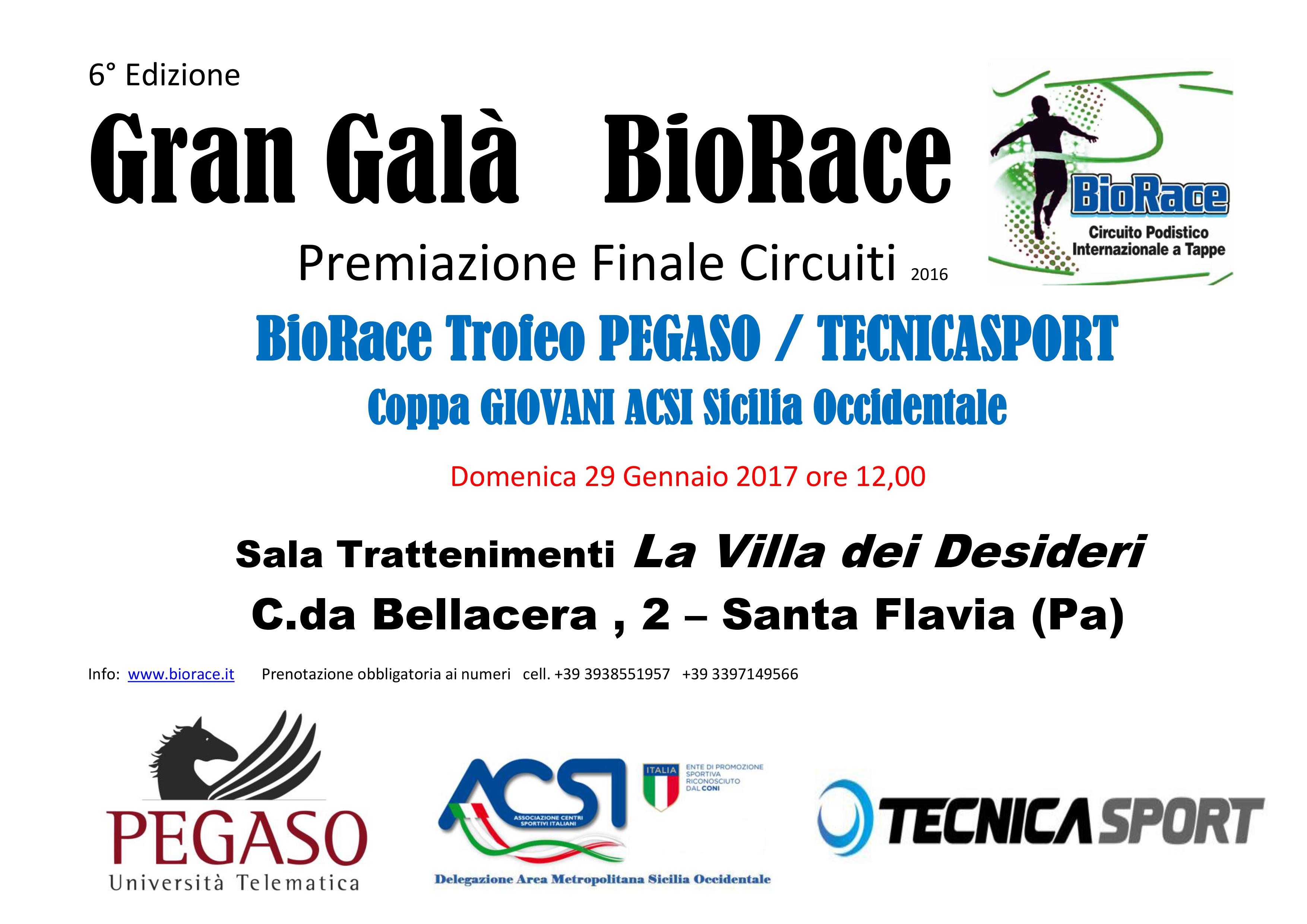 Centinaia di atleti provenienti da tutta la Sicilia saranno premiati per la loro partecipazione e le loro gesta agonistiche spese durante la stagione sportiva 2016. Il partecipato e prestigioso Circuito Internazionale BioRace, giunto al tredicesimo anno di età, nel 2016 è stato caratterizzato da dodici prove ufficiali ed altrettante prove challenger che hanno qualificato e animato il movimento podistico siciliano, le meravigliose cittadine coinvolte sono state: Alcamo, Palermo, San Vito Lo Capo, Balestrate, Trappeto, Ustica, Valledolmo, Partinico, Borgetto, Isola delle Femmine, Altofonte, Torretta, Termini Imerese, Corleone, Ribera, Patti, Montelepre, Misilmeri, Grisì e Villagrazia di Carini ognuna delle quali ha accolto nel migliore dei modi possibili i “Girini” del BioRace regalando nuove emozioni e ricordi indimenticabili.