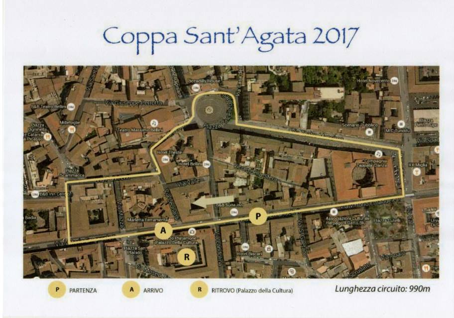Catania. C’è tempo fino a tutta la giornata di domani, domenica 29 gennaio per iscriversi alla 2a edizione della Coppa Sant’Agata – Trofeo Runcard, in programma venerdì 3 febbraio con partenza alle ore 15 da via Vittorio Emanuele all’altezza del Palazzo della Cultura (sicilia@tds-live.com). La manifestazione, organizzata dall’Asd Fortitudo Catania con il patrocinio del Comune di Catania, assessorato allo Sport e del Comitato per la festa di Sant’Agata del Coni Sicilia e con la collaborazione tecnica della Fidal Catania e del GGG Catania “Alfio Vittorio Pistritto”, rientra nel ricco calendario di manifestazioni sportive, culturali e religiose, promosse dal Comitato per la Festa presieduto da Francesco Marano, nella settimana che celebra la Santa di Catania.