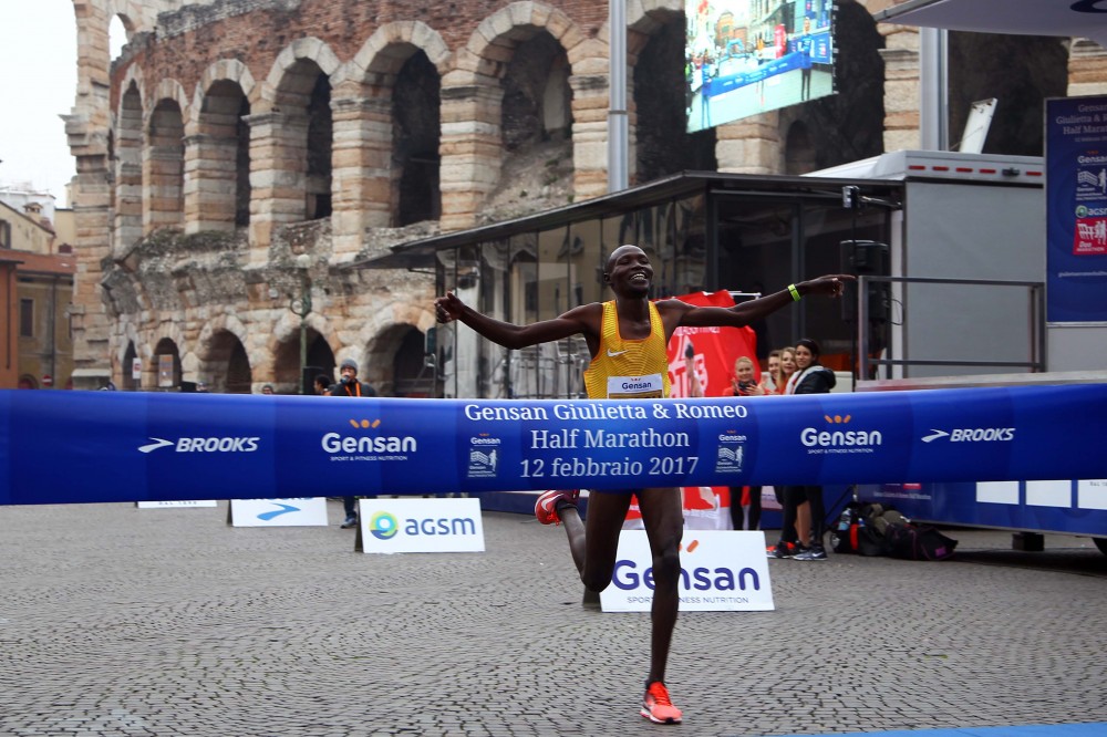grande tempo, decisamente migliore del 1h00’51” fatto nel 2014 dal connazionale William Kibor. Koech ha colto oggi il secondo successo sulle strade veronesi perché è proprio lui il re della Veronamarathon del novembre 2016. Sempre sotto l’Arena, sempre in piazza Bra, vinse due mesi fa la maratona in 2h10’53”. Oggi ha firmato parziali di gara importanti: 14’48” ai 5000 metri, 29’15” al 10,5km, 42’45” ai 15km con una media finale di circa 2’50” al chilometro: “Sono voluto tornare in questa splendida città – ha subito detto Edwin raggiante appena dopo aver tagliato il traguardo – Mi sono allenato duramente in Kenya dove vivo a Kapsabet allenandomi con il grande Stanley Biwott che ha vinto New York Marathon nel 2015. Ho centrato la vittoria, ho migliorato il mio personale sulla distanza che era di 1h01’16” e soprattutto ho fatto felice il pubblico e gli organizzatori facendo il primato del percorso. Ho corso praticamente da solo già dal terzo chilometro, stavo già andando forte ma ho accelerato ancora. Non è facile questo tracciato veronese e questo mi fa capire che magari con l’aiuto di una lepre qui è possibile correre anche sotto il muro dell’ora. Tornerò e proverò a firmare un 59’50” che credo sia nelle mie possibilità. Intanto ora mi concentro su una grande maratona da fare in Aprile”.