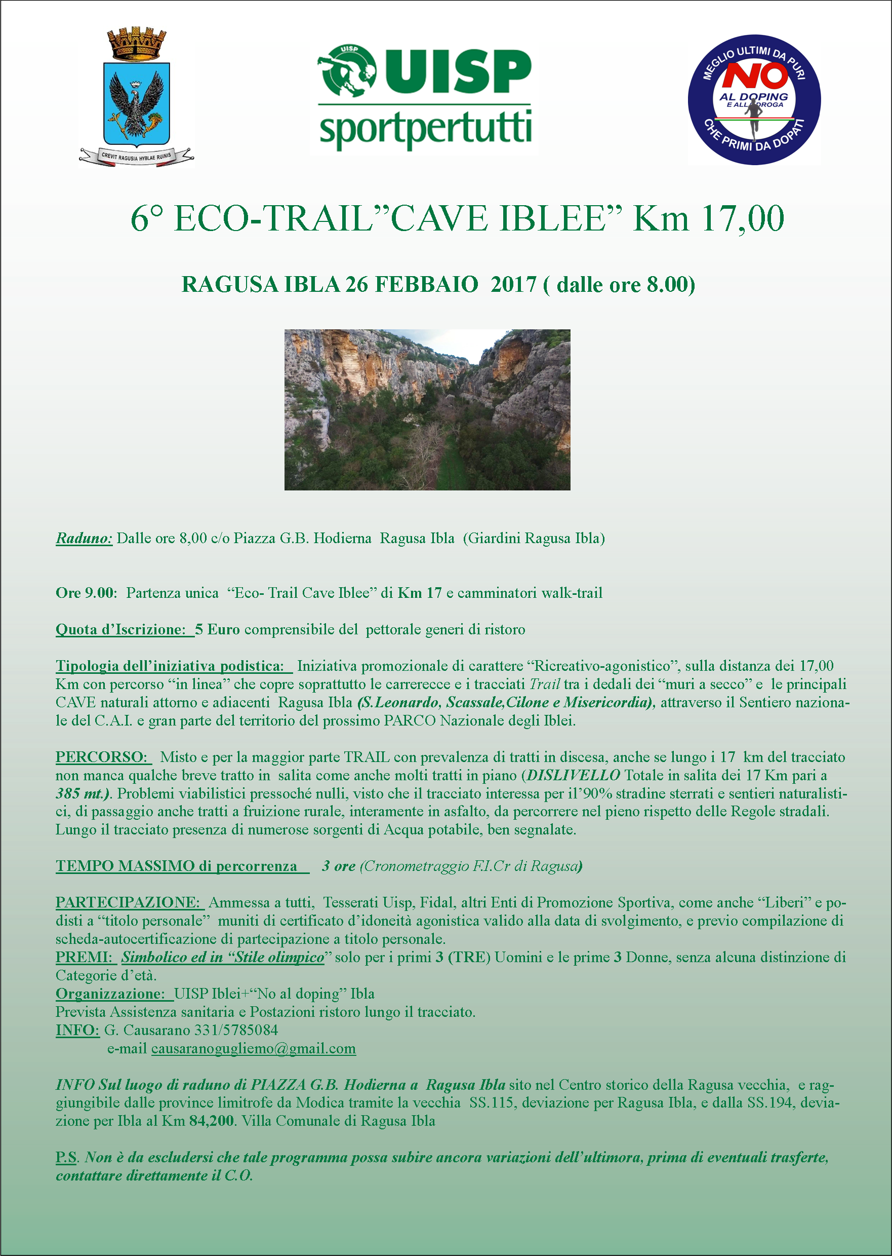 che avrà luogo proprio a Ibla e attraverserà per 17 km le fantastiche cave iblee. L’evento è organizzato dalla UISP IBLEI, dalla NO AL DOPING E ALLA DROGA di Ibla e dalle società AMUNì, SIEMU A PERI e TRE COLLI di Scicli. Oltre alla gara di Trail ci sarà infatti una gara di walktrail inserito nel primo Grand Prix Ibleo di Walk Trail. La partecipazione è aperta a tutti puchè muniti di adeguato certificato medico e associati a regolari società sportive.