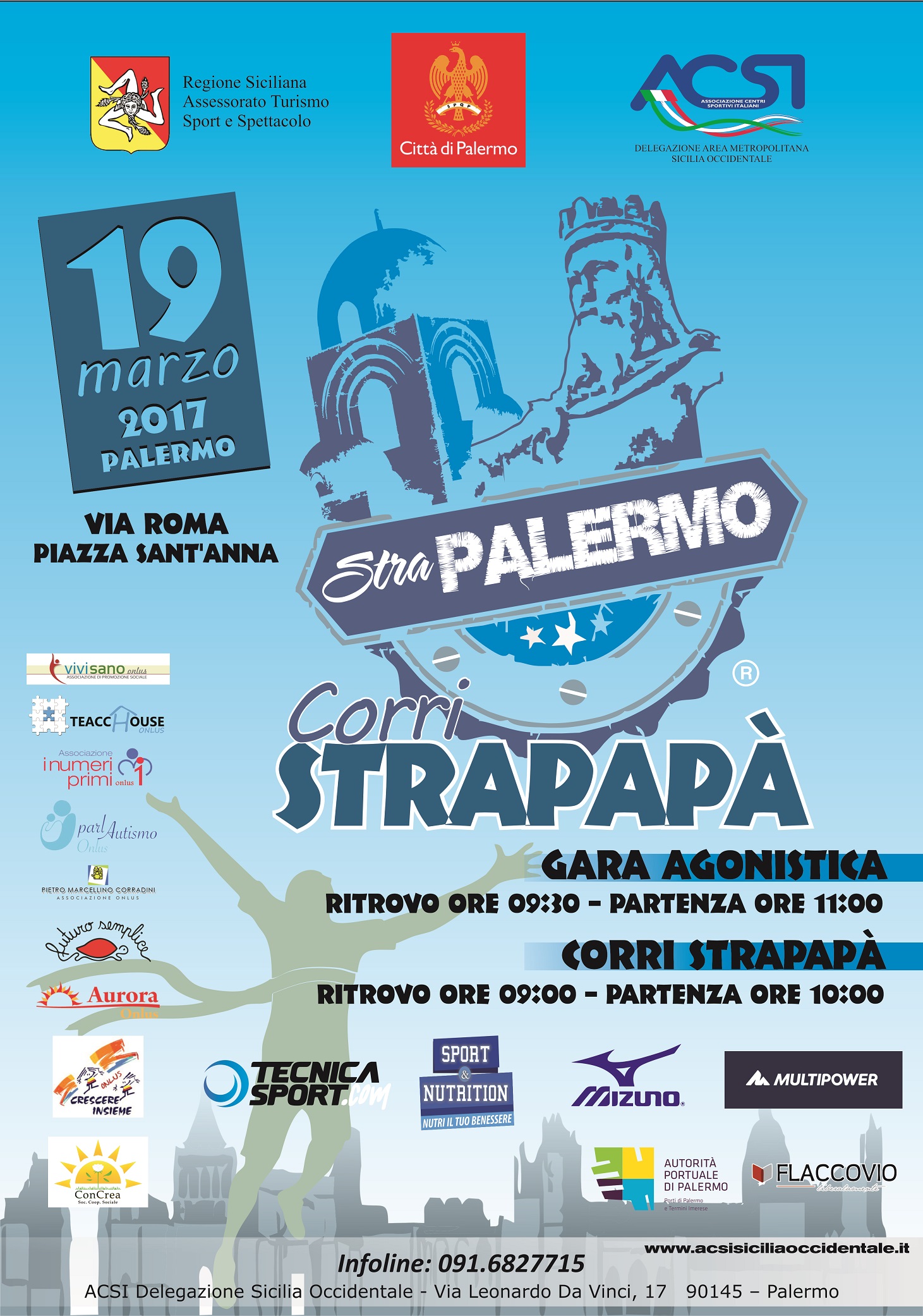 Palermo. Sono in corso le iscrizioni alla seconda edizione della StraPalermo – Corri StraPapà, la manifestazione organizzata dall’ACSI Sicilia Occidentale in collaborazione con il Comune di Palermo. Domenica 19 marzo un’onda di bambini con la maglia arancione, accompagnati dai loro genitori ed insegnanti, attraverserà le vie del centro storico palermitano in una giornata di sano