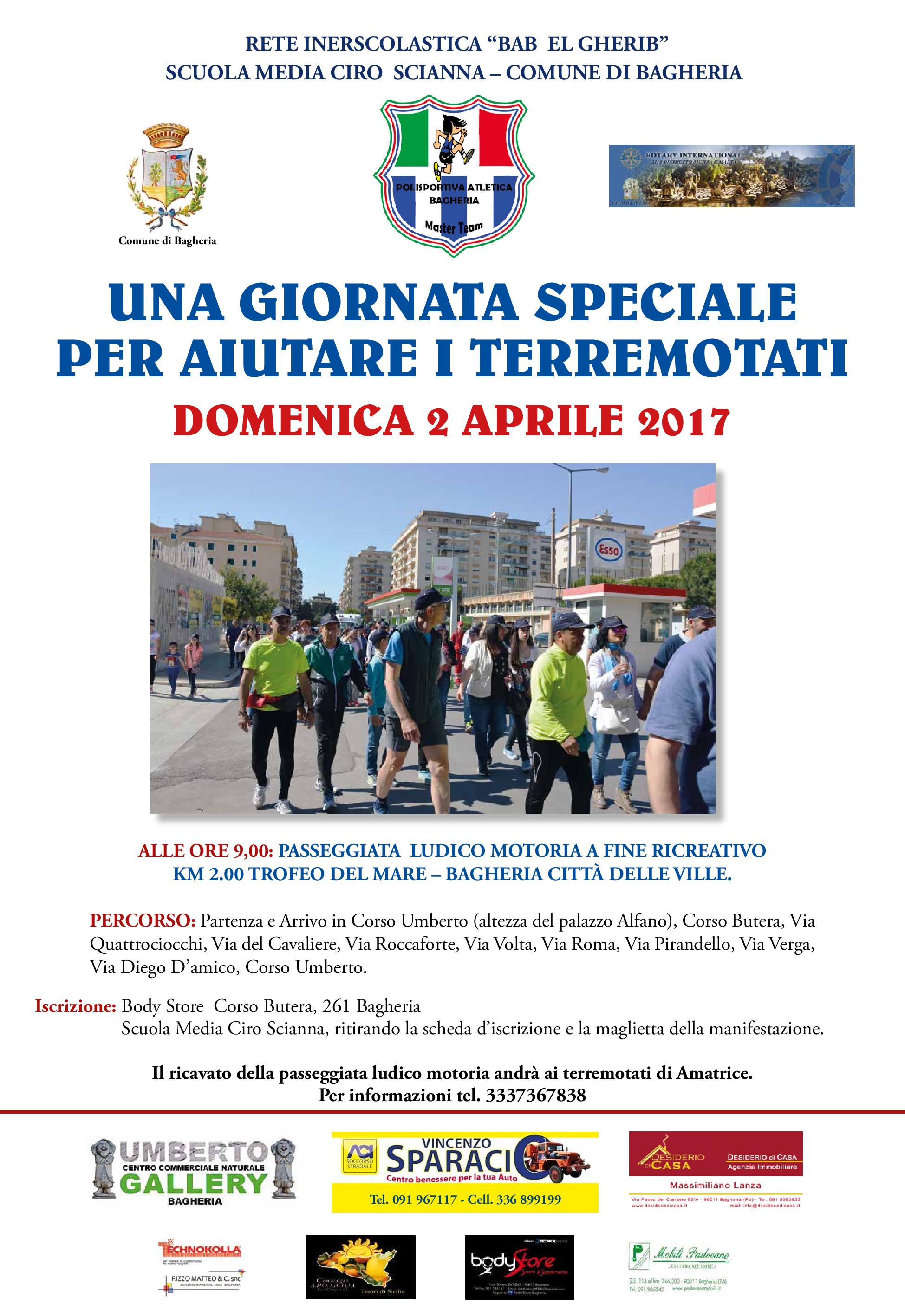 Bagheria (PA). Una giornata speciale per aiutare i terremotati. L’appuntamento è il 2 aprile quando, in occasione della 5a edizione del Trofeo del Mare – Bagheria città delle Ville, si svolgerà una passeggiata ludico motoria – ricreativa, il cui ricavato sarà devoluto ai terremotati di Amatrice.