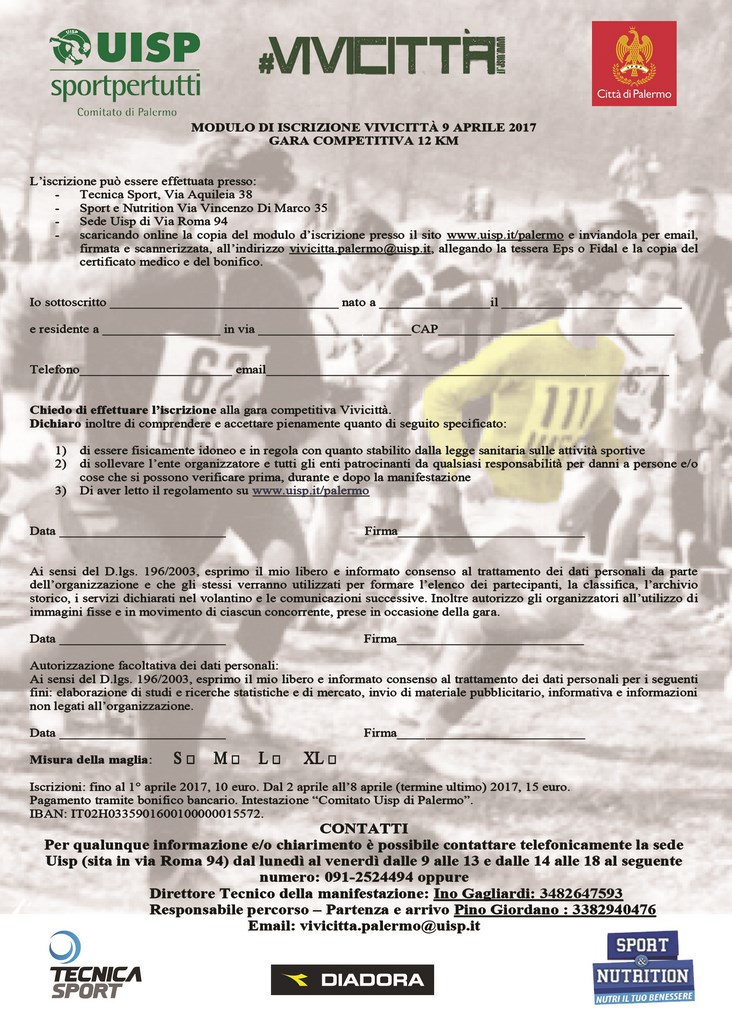 La quota d’iscrizione è di 10 euro (fino al 2 aprile). Dal 3 all’otto aprile (giorno della chiusura iscrizioni) sarà di 15 euro. E’ possibile iscriversi alla competitiva recandosi direttamente presso il negozio Tecnica Sport di via Aquileia 38 o il negozio Sport&Nutrition di Via Vincenzo Di Marco 35, oppure scaricando e compilando la scheda d’iscrizione, che dovrà essere inviata a vivicitta.palermo@uisp.it con allegato, tessera Eps o Fidal o Runcard, copia del certificato medico e del bonifico.Ogni società che iscriverà almeno 10 atleti (in unica soluzione) avrà diritto a due pettorali gratuiti.