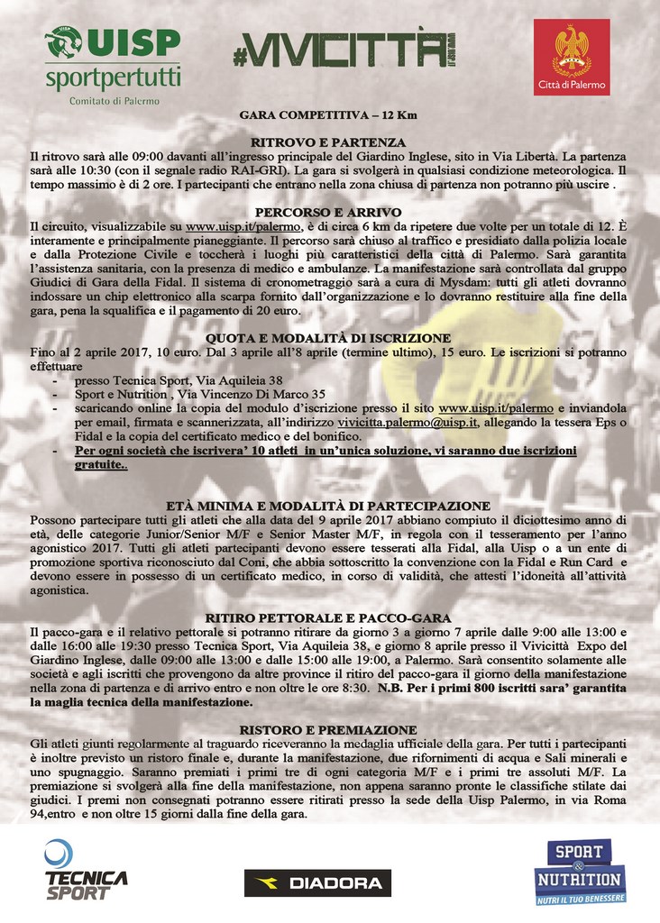 Maglia tecnica Diadora ai primi 800 iscritti e medaglia per tutti coloro che porteranno a termine la gara di 12 km. Quello di Palermo sarà il primo Vivicittà per Salvo Ferrante neo presidente provinciale della Uisp Palermo. Le conferme: accanto alla corsa agonistica ci sarà la non competitiva (tre i chilometri previsti) vero spettacolo di ogni Vivicittà. Coinvolti i giovani delle scuole palermitane che, per l’occasione, potranno essere accompagnati dai propri familiari.