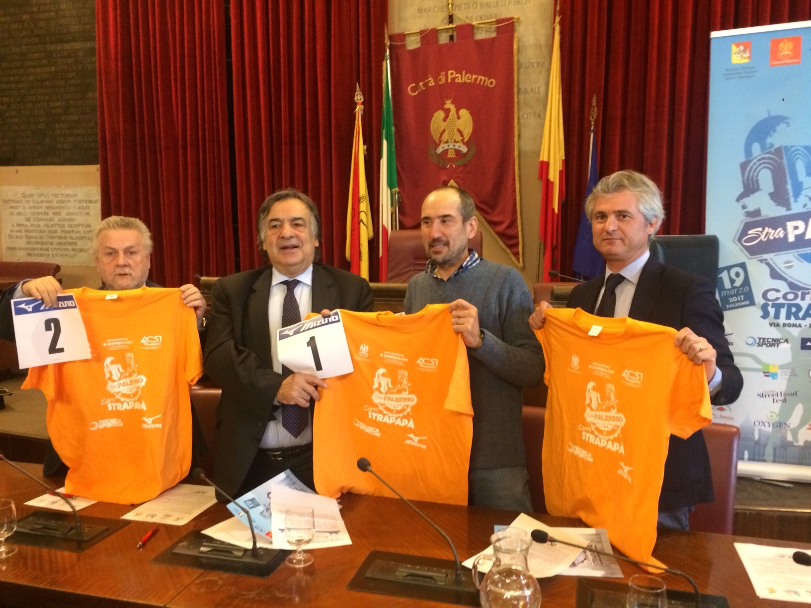 Palermo, 14 marzo 2017. È stata presentata questa mattina, nella sala Consiliare di Palazzo delle Aquile, la II edizione della StraPalermo, la grande manifestazione podistica che domenica prossima 19 marzo, colorerà il centro cittadino con la sua onda arancione.